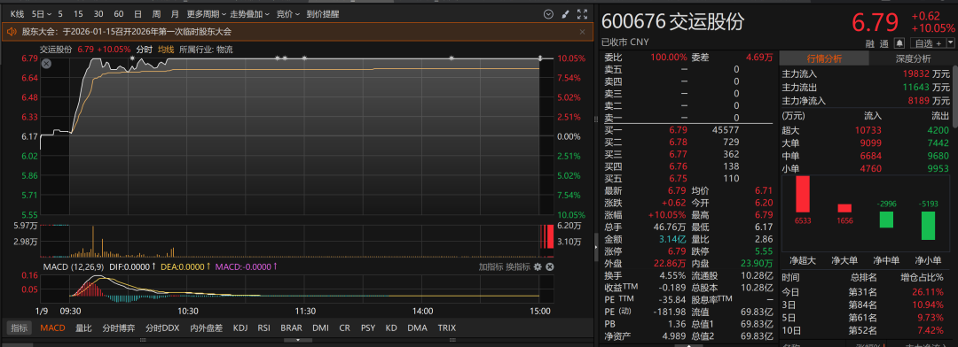 交运股份介绍,经初步筹划,拟置入的资产为控股股东久事集团及其关联方持有的文体娱乐业、旅游业相关业务资产,主要包含上海久事体育赛事运营管 理有限公司100%股权、新设立的体育场馆运营公司100%股权、上海久事智慧体育有限公司不低于62.40%股权、上海浦江游览集团有限公司100%股权和 上海久事演艺有限公司100%股权等。 1月9日晚,交运股份(600676)披露,公司筹划将所持有的乘用车销售与汽车后服务板块、汽车零部件制造与销售服务板块相关资产与控股股东上海久事 (集团)有限公司(简称"久事集团")及其关联方持有的文体娱乐业、旅游业相关业务资产进行置换。交易预计构成重大资产重组,本次交易公司股票不 停牌。 交运股份称,上市公司将借此实现业务战略转型,有利于上市公司改善资产质量、增强抗风险能力。公开资料则显示,拟置入资产涉及上海国际赛车场、 F1中国大奖赛等头部文体资源。 1月9日,交运股份提前异动,开盘快速冲高,在短暂波动后封住涨停。 业务有望实现战略转型 拟置出资产为交运股份所持有的乘用车销售与汽车后服务板块、汽车零部件制造与销售服务板块相关资产,主要包含上海市汽车修理有限公司100%股 权、上海交运汽车动 ...