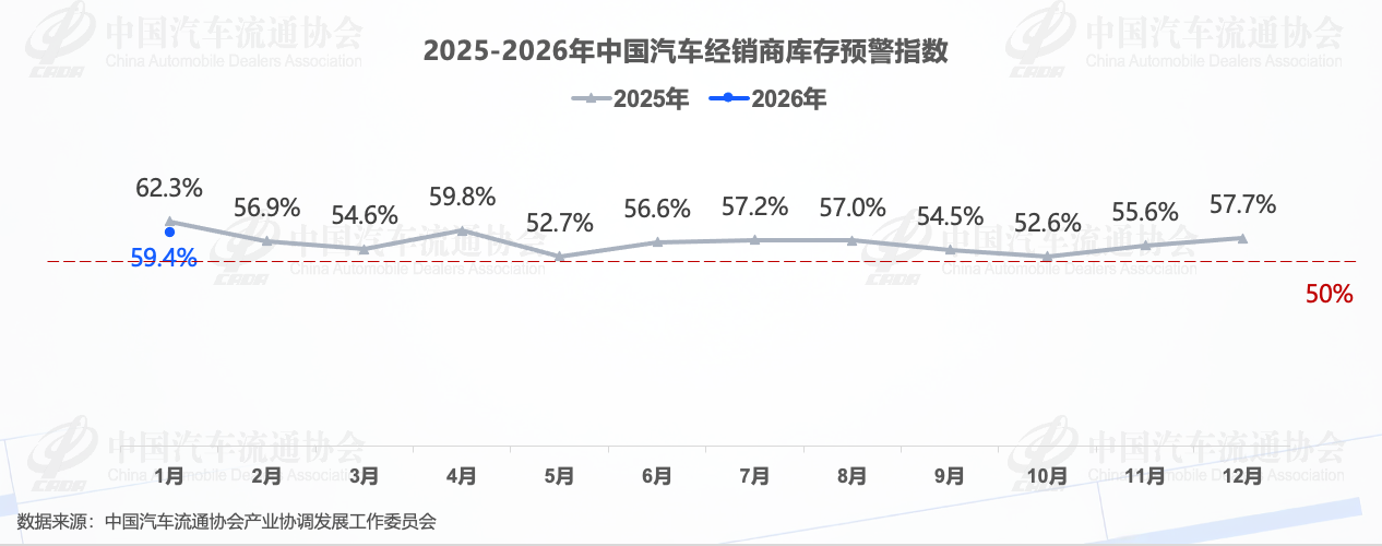 2026年1月中国汽车经销商库存预警指数分析 - 2026年1月中国汽车经销商库存预警指数为59.4%,同比下降2.9个百分点,环比上升1.7个百分点,指数位于50%荣枯线之上,显示整体市场压力较大 [1] - 1月库存分指数下降,反映经销商临近春节,谨慎提车,严控库存 [3] - 1月市场需求、平均日销量、从业人员分指数环比下降,反映节前市场较为平淡 [3] 区域与品牌表现 - 从区域指数看:1月全国总指数为59.4%,北区指数为59.0%,东区指数为58.4%,西区指数为54.3%,南区指数为66.1% [5] - 从分品牌指数看:1月豪华及进口品牌指数环比下降,主流合资、自主品牌指数环比上升 [6] 市场成交与价格状况 - 成交率方面:1月成交率下降,51.4%的经销商认为“下降”,38.2%认为“基本持平”,10.4%认为“增长” [7] - 成交价格方面:1月成交价格下降,36.1%的经销商认为“降价”,49.3%认为“基本持平”,14.6%认为“涨价” [8] - 库存量方面:1月库存量基本持平,25.2%的经销商认为库存量“下降”,49.3%认为“基本持平”,25.5%认为“增长” [8] 经销商对2月市场预期 - 对2月需求状况的判断:82.6%的经销商认为2月市场需求“减少”,11.1%认为“持平”,仅6.3%认为“增加” [10] - 对2月经营状况的判断:31.9%的经销商认为2月经营状况“不好”,59.0%认为“一般”,仅9.0%认为“好” [10] - 尽管春节前1-2周或涌现刚需及返乡群体购车小高峰,但春节长假导致有效销售时间较短,同时返乡潮对大中城市客流影响较大,2月车市面临较大下行压力 [11] 影响市场的主要因素 - 2026年1月市场动能偏弱,主要受新能源购置税退坡、上年四季度需求透支以及今年春节较晚等多重因素叠加影响 [10] - 2026年以旧换新补贴政策的补贴额度和申请流程有较大调整,短期来看未对车市形成强刺激效应 [10] - 调研显示,52.5%的经销商认为以旧换新政策对促进销售有一定作用,9.2%认为效果显著,40.4%认为效果尚不确定 [10] - 终端消费者观望情绪浓厚,68.8%的经销商反馈客流、订单量同比下滑,仅10.6%认为市场呈回暖趋势 [10] 经销商经营压力与厂家目标 - 53.9%的经销商认为厂家年度目标偏高,14.9%认为合理,超两成暂未评估 [1][11] - 超过一半的经销商认为厂家年度销量目标偏高,呼吁厂家调整销量目标、优化库存支持力度,及时出台帮扶政策 [11] - 1月份经销商GP1(新车销售毛利)呈普遍亏损较高状态,加上金融、衍生业务和厂家返利,GP3(总利润)接近盈亏平衡,反映经销商当前仍处于经营承压状态 [11] - 预计1月乘用车终端零售量约190万辆左右 [10]