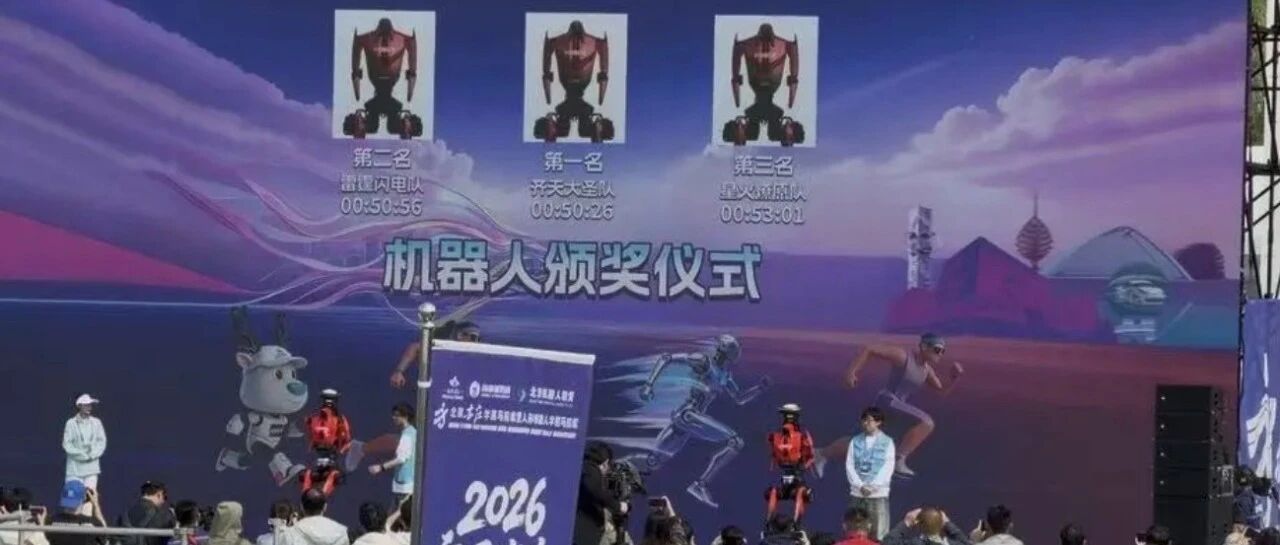 今天(19日),由北京市人民政府、中央广播电视总台等联合主办的2026人形机器人半程 马拉松鸣枪开跑。 最终,来自荣耀的齐天大圣队、雷霆闪电队、星火燎原队分别夺得冠军、亚军、季军,净用 时分别为50分26秒、50分56秒、53分01秒,超越了乌干达名将基普利莫在今年3月里斯本 半程马拉松赛中创造的57分20秒的人类男子半马世界纪录。 一年前在亦庄举行的首届人形机器人半程马拉松上,天工队的人形机器人"选手"以2小时40 分42秒的成绩夺冠,共6家机器人参赛队成功完赛。仅一年后,参赛队伍数量从去年的20 支增加至今年的百余支,整体完赛成绩大幅提升,人形机器人续航更稳、步态更顺、算法更 稳。 △齐天大圣战队自主导航机器人"闪电" 来源: 央视新闻 更多财经视频,请关注视频号"新浪财经" 往期回顾 北京到上海中途只充一次电!雷军15小时直播 ( 连 接 财 富 经 客户端 载 新 浪 财 下 ...