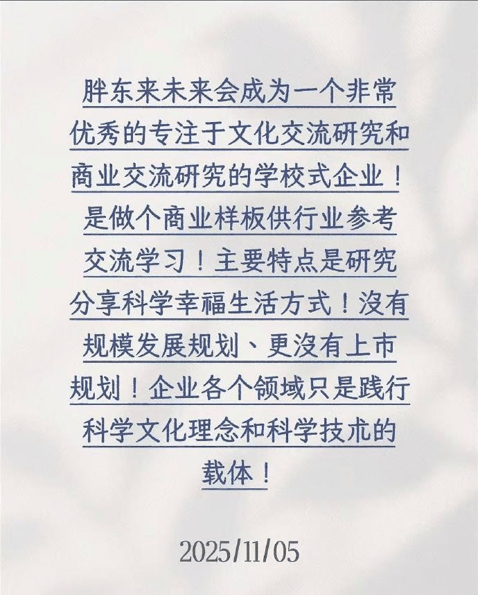 11月5日,据白鹿视频,胖东来创始人于东来在社交平台发文:"胖东来未来会成为一个非常优秀的专注于文化交流研究和商业交流研究的学校式企业!是 做个商业样板供行业参考交流学习!主要特点是研究分享科学幸福生活方式!沒有规模发展规划、更沒有上市规划!企业各个领域只是践行科学文化理念 和科学技术的载体!" 10月20日,胖东来发文称,为了让外界更好的了解和学习胖东来,将设立"胖东来开放日",给大家提供进入企业内部参观的渠道。 10月14日,于东来分享了其在2025中国超市调改大会上的演讲内容。在谈到企业价值与规模时,于东来表示,做企业是社会责任、社会价值,不只是为了 满足家族的私利和体现出自己的身价,企业的价值就是员工的幸福。于东来还提到,企业不要去做盲目的扩张,并透露胖东来账上的资金是41个亿,而且 没有贷款。 胖东来网站数据显示,截至11月3日,胖东来今年合计销售额已达197.64亿元。 此前,其已多次官宣开设企业家学习、分享交流活动。 胖东来开放日时间为2025年11月1日起的每月10日、20日,开放对象为企业级学习参访,参访范围为产业园、天使城、时代广场,参访人数方面,每批次 不超过15人,同一企业最多可预约5 ...