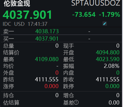 金价持续回调。 10月22日,国际金价延续下跌走势。截至记者发稿,伦敦金现下跌1.79%,报4037.901美元/盎司, 盘中价格一度下探至4023.59美元/盎司的低点,持续向4000美元/盎司重要关口靠近。 | 伦敦金现 | | | SPTAUUSDOZ | | --- | --- | --- | --- | | 4037.901 | | | -73.654 -1.79% | | IDC USD 17:41:37 | | | 8 | | 卖 | 4038.173 | | | | 买- | 4037.901 | | | | 总量 | O | 那手 | O | | 结算价 | | 开盘 | 4094.800 | | 最高 | 4109.080 | 最低 | 4023.590 | | 相介 | | 振幅 | 2.08% | | 外盘 | 0 | 内盘 | O | | 昨结 | 4111.555 | 昨天 | 4111.555 | | 涨停 | 0.000 | 跌停 | 0.000 | | 持仓 | O | 增仓 | O | | 促结算 | | 其差U | 0.00 | "近期金价回调,主要是因为交易过于拥挤,叠 ...