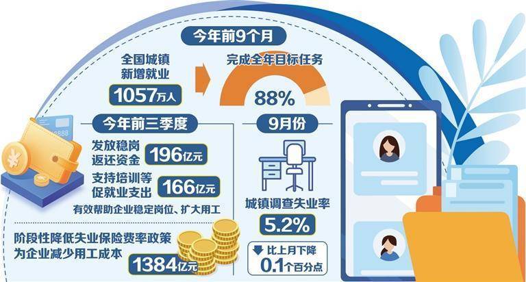 人力资源社会保障部最新数据显示,今年前9个月,全国城镇新增就业1057万人,完成全年目标任务的 88%;9月份城镇调查失业率5.2%,环比下降0.1个百分点。 今年以来,我国坚持把就业优先战略摆在突出位置,统筹推进稳增长、保就业、促创业各项工作,就业 市场呈现总体稳定、结构优化、质量提升的良好态势。稳定的就业形势彰显了经济韧性与政策效能。 稳岗扩岗成效显著 就业市场的总体稳定,离不开一系列精准有力的政策支持。今年,我国出台了关于进一步稳定和扩大就 业的一系列政策文件,形成了涵盖财政、税收、金融、产业等多领域的政策组合拳,为就业市场稳定提 供了坚实保障。 目前,各地着力实施岗位挖潜扩容方案,稳就业政策加快落实落地,政策红利持续释放。人社部政策研 究司司长崔鹏程介绍,前三季度,阶段性降低失业保险费率政策为企业减少用工成本1384亿元,发放稳 岗返还资金196亿元,支持培训等促就业支出166亿元,有效帮助企业稳定岗位、扩大用工。 分区域与市场层面看,东部沿海地区依托新兴产业集聚,持续发挥吸纳就业主阵地作用;中西部地区通 过承接产业转移和新型城镇化建设,就业吸引力稳步提升;东北地区则借助老工业基地振兴与产业结构 调整 ...