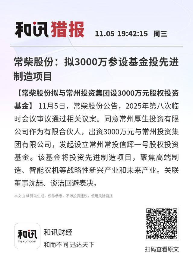 【常柴股份拟与常州投资集团设3000万元股权投资基金】11月5日,常柴股份公告,2025年第八次临时 会议审议通过相关议案。同意常州厚生投资有限公司作为有限合伙人,出资3000万元与常州投资集团有 限公司,发起设立常州常投信辉一号股权投资基金。该基金将投资先进制造项目,聚焦高端制造、智能 农机等战略性新兴产业和未来产业。关联董事沈喆、谈洁回避表决。 本文由 AI 算法生成,仅作参考,不涉投资建议,使用风险自担 ...