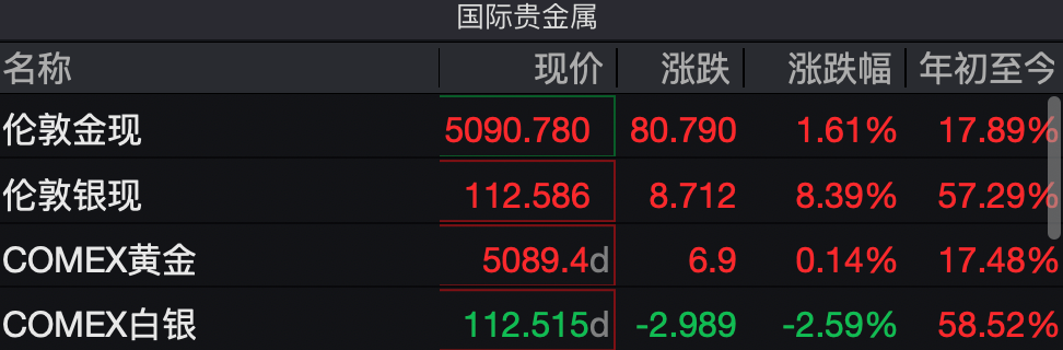 港、A股贵金属股集体走强。A股中,湖南黄金、恒邦股份涨停,晓程科技涨超9%,中金黄金、招金黄金涨超8%;港股中,中国白银集团涨超10%,中国 黄金国际、赤峰黄金涨超6%。 | 贵金属 了 | | | | --- | --- | --- | | 伦敦金现 | 伦敦银现 | COMEX黄金 | | 5081.358 | 108.962 | 5087.6 | | +93.188 +1.87% +5.621 +5.44% +107.9 +2.17% | | | | COMEX白银 | SHFE黄金 | SHFE自银 | | 108.460 | 1144.36 | 27531 | | +7.127 +7.03% | | +41.50 +3.76% +3406 +14.12% 三格隆汇 | 今日,现货黄金历史首次突破5000美元/盎司整数大关,白银涨破108美元续刷新高。 截止发稿,现货黄金涨幅扩大至1.87%,刷新历史新高至5081美元/盎司,本月累涨超730美元。现货白银涨超5%,刷新历史高点至每盎司108.962美元,月 内暴涨超50%。现货铂金首次站上2890美元/盎司,今年首月累涨约40%。 受国际金价影响,国 ...