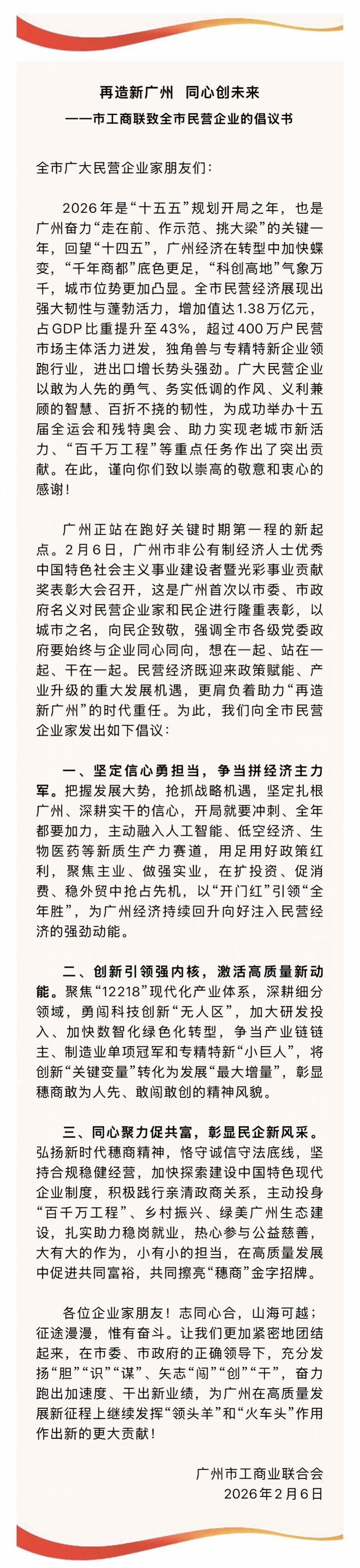 广州市民营经济发展现状与贡献 - 广州市民营经济展现出强大韧性与蓬勃活力,其增加值达到1.38万亿元,占全市GDP比重提升至43% [1] - 全市民营市场主体超过400万户,其中独角兽与专精特新企业领跑行业,进出口增长势头强劲 [1] - 民营经济为成功举办十五届全运会和残特奥会、助力实现老城市新活力、“百千万工程”等重点任务作出了突出贡献 [1] 广州市对民营企业的支持与期许 - 广州市首次以市委、市政府名义召开表彰大会,对民营企业家和民企进行隆重表彰,强调各级党委政府要始终与企业同心同向 [3] - 倡议书呼吁民营企业家发扬“闯”“创”“干”精神,为广州在高质量发展新征程上发挥“领头羊”和“火车头”作用贡献民营力量 [1][4] - 广州正站在跑好关键时期第一程的新起点,2026年是“十五五”规划开局之年,也是广州奋力“走在前、作示范、挑大梁”的关键一年 [1][3] 对民营企业发展的具体倡议方向 - 坚定信心勇担当,争当拼经济主力军:把握发展大势,抢抓战略机遇,主动融入人工智能、低空经济、生物医药等新质生产力赛道,在扩投资、促消费、稳外贸中抢占先机 [3] - 创新引领强内核,激活高质量新动能:聚焦“12218”现代化产业体系,加大研发投入、加快数智化绿色化转型,争当产业链链主、制造业单项冠军和专精特新“小巨人” [3][4] - 同心聚力促共富,彰显民企新风采:积极践行亲清政商关系,主动投身“百千万工程”、乡村振兴、绿美广州生态建设,扎实助力稳岗就业,热心参与公益慈善 [4]