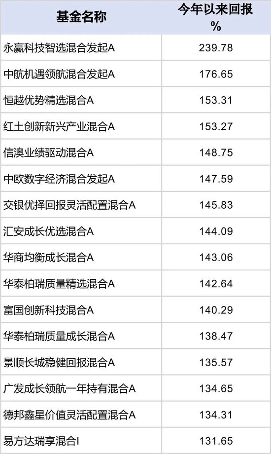 炒股就看金麒麟分析师研报,权威,专业,及时,全面,助您挖掘潜力主题机会! 2025年只剩一个交易日了。对于基金经理而言,这最后4个小时的交易时间,就是最后的年度业绩决战 时刻。 从年内基金业绩排名看,截至12月30日,重仓AI概念股的基金业绩居前,年内净值翻倍的基金超过80 只。其中,永赢科技智选混合基金以239.78%的收益率大幅领跑,基本锁定年度冠军。但当前排名前十 的基金业绩差距较小,最终年度排名充满变数。从部分绩优基金经理的最新观点看,科技成长方向依然 是接下来关注的重点。 年度排名充满变数 在2025年的震荡上行行情中,公募基金整体业绩表现不错。据Choice资讯统计,截至12月30日,在4600 多只主动权益类基金中,年内平均收益高达31.25%,833只基金年内收益率超过50%,更有80多只基金 年内净值翻倍。 以下是年内收益率超过130%的主动权益类基金。 | 县 : 名称 | 今年以来回报 | | --- | --- | | | % | | 永赢科技智选混合发起A | 239.78 | | 中航机遇领航混合发起A | 176.65 | | 恒越优势精选混合A | 153.31 | | 红土创 ...