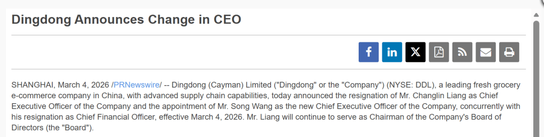核心管理层变动 - 公司创始人兼原首席执行官梁昌霖辞去CEO职务,将继续担任董事会主席[1] - 任命拥有近4年公司核心管理层经验的王松为新任首席执行官,即日生效[1] - 首席技术官蒋旭因个人原因将于3月底前提交辞呈,其职责由现有高管团队承接[1] 新任首席执行官背景 - 王松自2023年12月起先后担任公司高级副总裁兼董事、首席财务官及叮咚谷雨董事长,全面了解公司业务[1] - 2024年全年,王松全面负责公司日常运营,成功带领公司实现规模与利润双增长[1] - 王松拥有近20年消费零售行业经验,曾任职于饿了么、盒马鲜生、联华超市等头部企业,在财务管控与供应链整合领域积淀深厚[7] 公司近期财务表现 - 2025年第四季度公司实现营收62.426亿元,同比增长5.7%,连续八个季度同比增长[9] - 2025年第四季度GMV达67.032亿元,同比增长2.4%,同样连续八个季度实现同比增长[9] - 2025年第四季度GAAP净利润为3360万元,同比下降63.3%;非GAAP净利润为5080万元,同比下降56.5%[9] - 有分析指出,公司虽然盈利,但净利率1.2%-1.5%仍处于较低水平[12] 公司被美团收购及整合情况 - 2025年2月5日,美团宣布以7.17亿美元全资收购叮咚买菜中国业务,此次管理层调整发生在收购完成一个月后[2][9] - 收购完成后,叮咚买菜将成为美团的间接全资附属公司,其财务业绩将并入美团财务报表[9] - 根据并购协议,原股东可在确保目标集团净现金不低于1.5亿美元的前提下,于2026年8月底前提取不超过2.8亿美元资金,股东最高可获得的总回报接近9.97亿美元[9] - 公司计划在交易完成后,将出售所得款项的绝大部分用于股份回购和/或派息[9] - 公司海外业务不在本次交易范围内,将在交割前完成剥离[11] 公司业务模式与发展历程 - 公司于2017年在上海入局生鲜电商,采用前置仓模式,即在社区3公里内建立仓库进行存储和配送[6] - 前置仓模式导致仓库租金、运营及履约费用高企,影响盈利[6] - 2021年末,公司前置仓数量达到峰值1400个,覆盖城市数量升至37个[6] - 受高昂成本制约,公司目前仍是一家区域性生鲜电商平台,经营范围主要在长三角[4][6] - 公司建立了较强的供应链能力,85%以上生鲜源头直采,拥有12家自营工厂和2家自营农场[11] 行业竞争格局与公司前景 - 国内即时零售市场竞争日趋白热化,生鲜即时零售已成为阿里、美团、京东等头部平台重点布局领域[11] - 公司仍面临美团小象超市、盒马等对手的竞争,增长空间受限[12] - 创始人梁昌霖表示,选择与美团合并是董事会经过慎重论证的决定,认为合并是更具有远见的决定,能与美团小象超市形成优势互补[10][11][12] - 即时零售赛道愈发激烈的竞争,正在让垂直生鲜电商的生存空间不断收窄,被收购后其发展策略和定位是否变化仍是未知数[12]