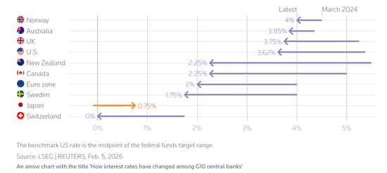 全球央行货币政策分化格局 - 全球金融格局正经历“冰火两重天”,主要经济体央行货币政策路径显著分化 [1][20] - 一边是美英央行在宽松边缘徘徊,另一边澳、新、日央行已悄然踏入紧缩阵营 [1][20] - 全球主要经济体的央行正走在不同的道路上 [1][20] 美国 - 美联储在上个月维持利率不变,并暗示可能需要等待很长时间才会进一步降息 [3][23] - 交易员已完全消化了7月前再次降息25个基点的预期 [3][23] - 特朗普提名的候选人沃什(Kevin Warsh)将在5月鲍威尔任期届满后接任美联储主席,他曾呼吁降息并缩减资产负债表 [3][23] 英国 - 英国央行周四维持利率不变,但投票结果为意外微弱的5比4 [6][26] - 随着工资增长放缓,进一步宽松已成为一个现实选项 [6][26] - 这一出人意料的鸽派倾向,导致对政策敏感的2年期国债收益率创下2024年4月以来的最大单日跌幅 [6][26] - 交易员目前预计,到年底利率将下调近50个基点 [6][26] 挪威 - 挪威央行上月将基准利率维持在4%,并重申今年晚些时候可能降息,但并非迫在眉睫 [7][27] - 进一步宽松与最新数据并不契合,挪威去年12月的核心通胀率意外升至3.1%,凸显出国内需求的韧性 [7][27] 瑞士 - 瑞士央行的利率为0%,是全球主要央行中最低的,且目前可能维持现状 [8][28] - 长期通胀预期处于0%至2%的目标范围内,但价格压力依然低迷 [8][28] - 避险货币瑞郎兑美元和欧元的汇率正处于多年高点 [8][28] 加拿大 - 加拿大央行在1月将利率维持在2.25% [9][29] - 决策者警告称,地缘政治风险以及美国贸易政策的不确定性可能对经济造成新冲击,从而需要进一步的货币宽松 [9][29] - 由于关税不确定性削弱了商业信心并抑制了投资,加拿大去年11月的经济增长已出现放缓 [9][30] 欧元区 - 欧洲央行周四如期将基准利率维持在2% [10][30] - 交易员预计今年利率不会有变化,但近期美元下跌、大宗商品市场波动,以及特朗普政府围绕格陵兰岛的言论压力,都暗示情况可能迅速生变 [10][30] 瑞典 - 瑞典央行在1月29日将利率维持在1.75%,并发出政策可能在“未来一段时间内”保持不变的信号 [13][33] - 尽管预计瑞典经济今年将回升且通胀将降温,但地缘政治风险依然笼罩 [13][33] 新西兰 - 新西兰正在转向鹰派阵营,随着第四季度年化通胀率加速至3.1%,新西兰联储可能已经结束了宽松周期 [14][34] - 市场目前预期年底前将有两次25个基点的加息 [14][34] 澳大利亚 - 澳洲联储在周二提高了利率,距离去年8月的最后一次降息仅过去半年 [15][35] - 数据显示消费者支出强劲,房价创历史新高,且家庭与企业的信贷充足,增强了市场对金融环境远未达到限制性水平的担忧 [15][35] - 交易员预计年中将再次加息 [15][35] 日本 - 日本央行此前是唯一坚持紧缩的央行,而现在它不再是孤例 [16][36] - 决策者警告称,日元疲软正在带来强于预期的价格压力,部分人士担心政策可能滞后 [16][36] - 日本央行在去年12月将利率提高至30年来最高水平,随后在1月维持利率稳定 [16][36] - 首相高市早苗的鸽派倾向可能会使日本央行的路径复杂化,尤其是如果她在周日的提前选举中获得强势授权 [16][36]