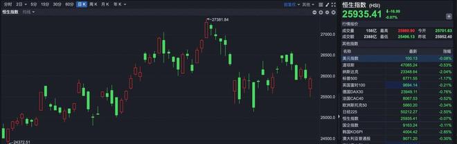 | 分时 2日 = 5分 15分 30分 40分 国家 周K 月K 年K + | 110+ MM = E / : 恒生指数 (HSI) | | | | | | --- | --- | --- | --- | --- | --- | | 悟生損難 相继 · | 0000 | 25935.41 | 4-16.39 | | | | | -27381.84 | | -0.07% | | | | | | 旺情报价 | | | | | | | 成交量 | 156亿 超高 | 2500000 今月 | 25701.63 | | | 27000.0 | 煤交部 | 2388亿 最低 | 25406.13 昨夜 | 25952.40 | | | | 加纳酒费 | | | | | | 26500.0 | | | | 30 | | | | 质免费图 | | 100.13 | -0.08% | | | | 通常新 | | 47005.24 | | | | | 内原达克 | | 23348.64 | -2.04% | | | | 009888 | | 6771.55 | -1.17% | | | | 美国富时100 | | 0004. ...
