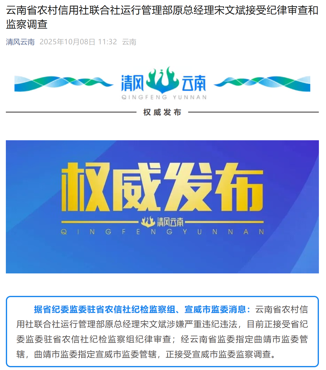 【导读】云南省联社运行管理部原总经理宋文斌接受纪律审查和监察调查 假期反腐不停歇!又有金融干部被查。 10月8日,"清风云南"发布消息,云南省农村信用社联合社运行管理部原总经理宋文斌涉嫌严重违纪违法,目前正接受省纪委监委驻省农信社纪检监察 组纪律审查;经云南省监委指定曲靖市监委管辖,曲靖市监委指定宣威市监委管辖,正接受宣威市监委监察调查。 今年以来,云南省联社旗下已有多名干部被查、被处理,包括原党委委员、纪委书记高波,楚雄办事处原党委委员、副主任陈永岗,昭通办事处原主 任胡宗翔等。 今年6月,云南省联社公布巡视整改进展情况,其中提到:将紧盯重点领域、关键环节织密廉洁风险防控网,持续开展整治形式主义为基层减负,着力 营造团结向上、风清气正的政治生态。 公开信息显示,宋文斌在云南农信系统工作多年,曾任云南省联社丽江办事处主任等职务。另外,宋文斌曾担任云南省农村信用社科技结算中心的法 定代表人,2016年变更为他人。 2022年11月,宋文斌以云南省联社运行管理部总经理的身份参加全国农信机构运营精细化管理座谈会。彼时宋文斌表示,云南农信运行管理部成立于 2020年,规范化、标准化的运行管理起步较晚,因此可以充分借鉴 ...