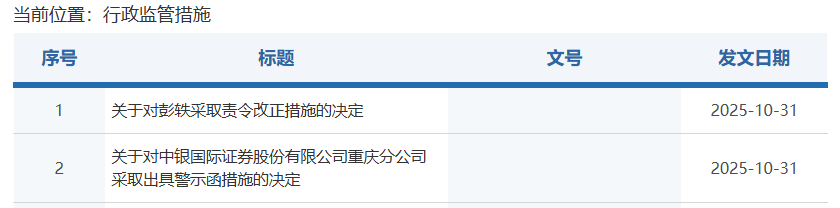 又一家券商被监管"点名"。 近日,重庆证监局下发一纸行政监管措施决定书,剑指中银证券重庆分公司存在从业人员使用他人证券账户持有、买卖 股票,违规操作客户证券账户,将客户证券账户交由他人使用的违规行为。 | 序号 | 标题 | 文号 | 发文日期 | | --- | --- | --- | --- | | - | 关于对彭轶采取责令改正措施的决定 | | 2025-10-31 | | 2 | 关于对中银国际证券股份有限公司重庆分公司 采取出具警示函措施的决定 | | 2025-10-31 | 重庆证监局认为,中银证券重庆分公司未能及时发现并有效防范上述行为,反映出该分公司内部管理薄弱,对股票异常 交易情形缺乏有效监测和处理,对从业人员合规管理不到位。因此,重庆证监局决定对该分公司出具警示函,对违规从 业人员则采取责令改正措施。 这并非中银证券年内首张罚单。2025年以来,中银证券的违规问题呈现出明显的多发态势,且违规场景与主体覆盖多地 分支机构及从业人员。 2025年5月,江西证监局对中银证券赣州营业部经纪人郭清平发出警示,因其超范围推介非公司提供的投资信息及发行 或代销的金融产品信息。同月,新疆证监局也对中银 ...