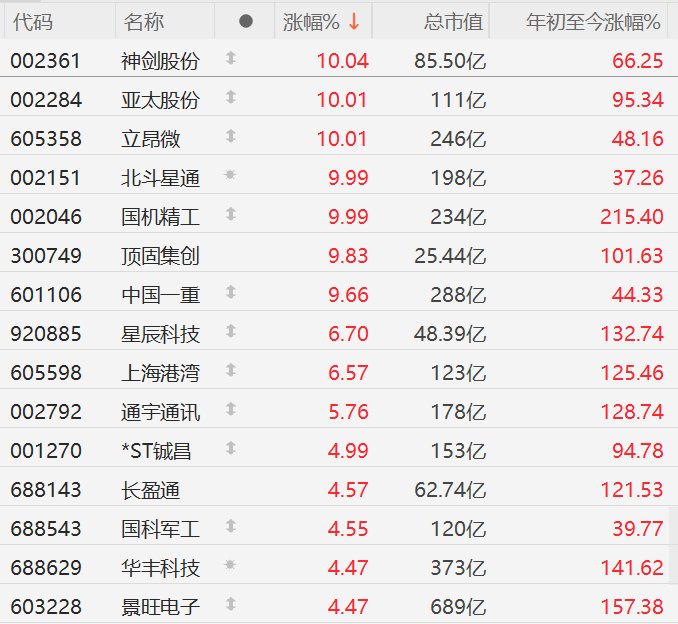 股票频道更多独家策划、专家专栏,免费查阅>> 责任编辑:栎树 另外,中信证券研报称,截至2025年12月中SpaceX已成功将3095颗星链卫星送入轨道,国内有望研发 出对标猎鹰9号的可回收中型运载火箭,运力瓶颈即将突破拐点将至。随着发射成本大幅下降,卫星、 终端、算力等市场有望加速兑现,商业航天的投资主线地位即将得到确认。随着中国星网和G60千帆星 座先后进入批量化发射阶段,以及海南商业航天发射场和商业运载火箭的投入使用,大运力、低成本趋 势正引领商业航天开启新时代,同时空间算力也进一步打开行业天花板,万亿市场规模的新赛道即将扬 帆起航,为相关产业链带来巨大的发展契机。从投资端看,目前锐度较高的方向是太空算力和可回收火 箭,而低轨通信卫星链是目前最先有基本面逻辑和订单支持的细分。 | 代码 | 名称 | | 涨幅% ↓ | 总市值 | 年初至今涨幅%。 | | --- | --- | --- | --- | --- | --- | | 002361 | 神剑股份 | 1 | 10.04 | 85.50亿 | 66.25 | | 002284 | 亚太股份 | 1 | 10.01 | 111亿 | 95.34 ...