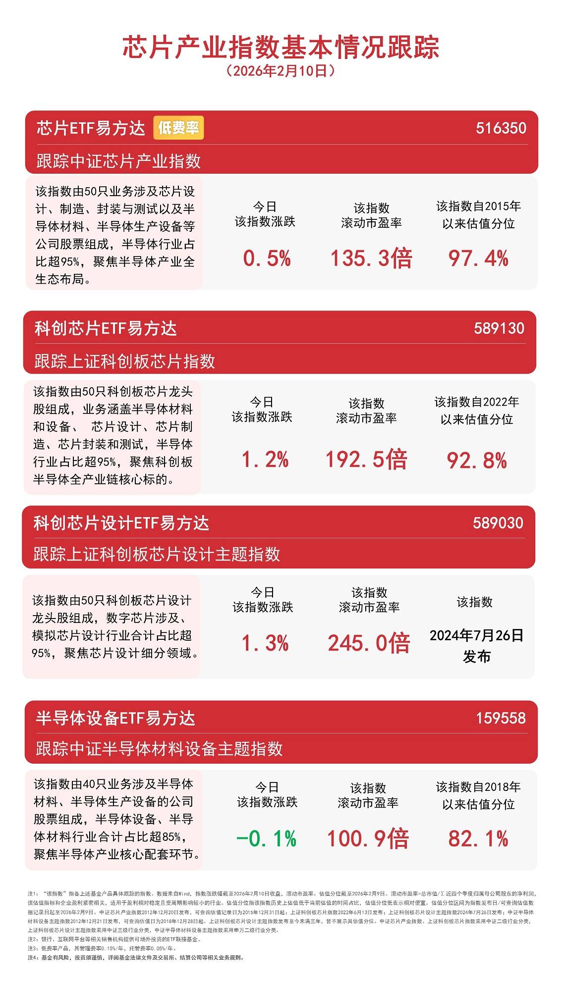 产品概览 - 易方达提供四只聚焦半导体产业的ETF产品,分别跟踪不同的主题指数,覆盖芯片全产业链、科创板芯片、科创板芯片设计以及半导体材料与设备等细分领域 [2] - 四只产品的基金代码分别为516350、589130、589030、159558 [2] 指数构成与特点 - **中证芯片产业指数**:由50只业务涉及芯片设计、制造、封装测试、半导体材料及设备的公司股票组成,半导体行业占比超过95%,聚焦全生态布局 [2] - **上证科创板芯片指数**:由50只科创板芯片龙头股组成,业务涵盖半导体材料设备、芯片设计、制造、封装测试,半导体行业占比超过95%,聚焦科创板核心标的 [2] - **上证科创板芯片设计主题指数**:由50只科创板芯片设计龙头股组成,数字与模拟芯片设计行业合计占比超过95%,聚焦芯片设计细分领域 [2] - **中证半导体材料设备主题指数**:由40只业务涉及半导体材料与设备的公司股票组成,半导体设备与材料行业合计占比超过85%,聚焦核心配套环节 [3] 指数估值与表现数据 - **中证芯片产业指数**:截至2024年2月9日,滚动市盈率为135.3倍,自2015年以来的估值分位为97.4% [2] - **上证科创板芯片指数**:截至2024年2月9日,滚动市盈率为192.5倍,自2022年以来的估值分位为92.8% [2] - **上证科创板芯片设计主题指数**:截至2024年2月9日,滚动市盈率为245.0倍,该指数于2024年7月26日发布,发布未满三年故不展示估值分位 [2] - **中证半导体材料设备主题指数**:截至2024年2月9日,滚动市盈率为100.9倍,自2018年以来的估值分位为82.1% [3] 指数近期市场表现 - 截至2024年2月10日收盘,中证芯片产业指数当日涨跌幅为0.5% [2] - 截至2024年2月10日收盘,上证科创板芯片指数当日涨跌幅为1.2% [2] - 截至2024年2月10日收盘,上证科创板芯片设计主题指数当日涨跌幅为1.3% [2] - 截至2024年2月10日收盘,中证半导体材料设备主题指数当日涨跌幅为-0.1% [3] 产品费率与销售 - 相关ETF产品为低费率产品,管理费率为每年0.15%,托管费率为每年0.05% [4] - 银行、互联网平台等销售机构提供可场外投资的ETF联接基金 [4] 数据来源与说明 - 指数数据来源于Wind,指数涨跌幅数据截至2024年2月10日收盘,滚动市盈率与估值分位数据截至2024年2月9日 [3] - 滚动市盈率计算公式为总市值除以最近四个季度归属母公司股东的净利润 [3] - 估值分位指该指数历史估值低于当前估值的时间占比,分位越高表示相对越贵,估值分位区间为自各指数可查询估值记录日起至2024年2月9日 [3] - 各指数发布与可查询估值起始日如下:中证芯片产业指数于2012年12月20日发布,可查记录自2015年12月31日起;上证科创板芯片指数于2022年6月13日发布;上证科创板芯片设计主题指数于2024年7月26日发布;中证半导体材料设备主题指数于2012年12月21日发布,可查记录自2016年12月28日起 [3] - 各指数采用的行业分类标准不同:中证芯片产业指数与上证科创板芯片指数采用中证二级行业分类,上证科创板芯片设计主题指数采用中证三级行业分类,中证半导体材料设备主题指数采用申万二级行业分类 [3]