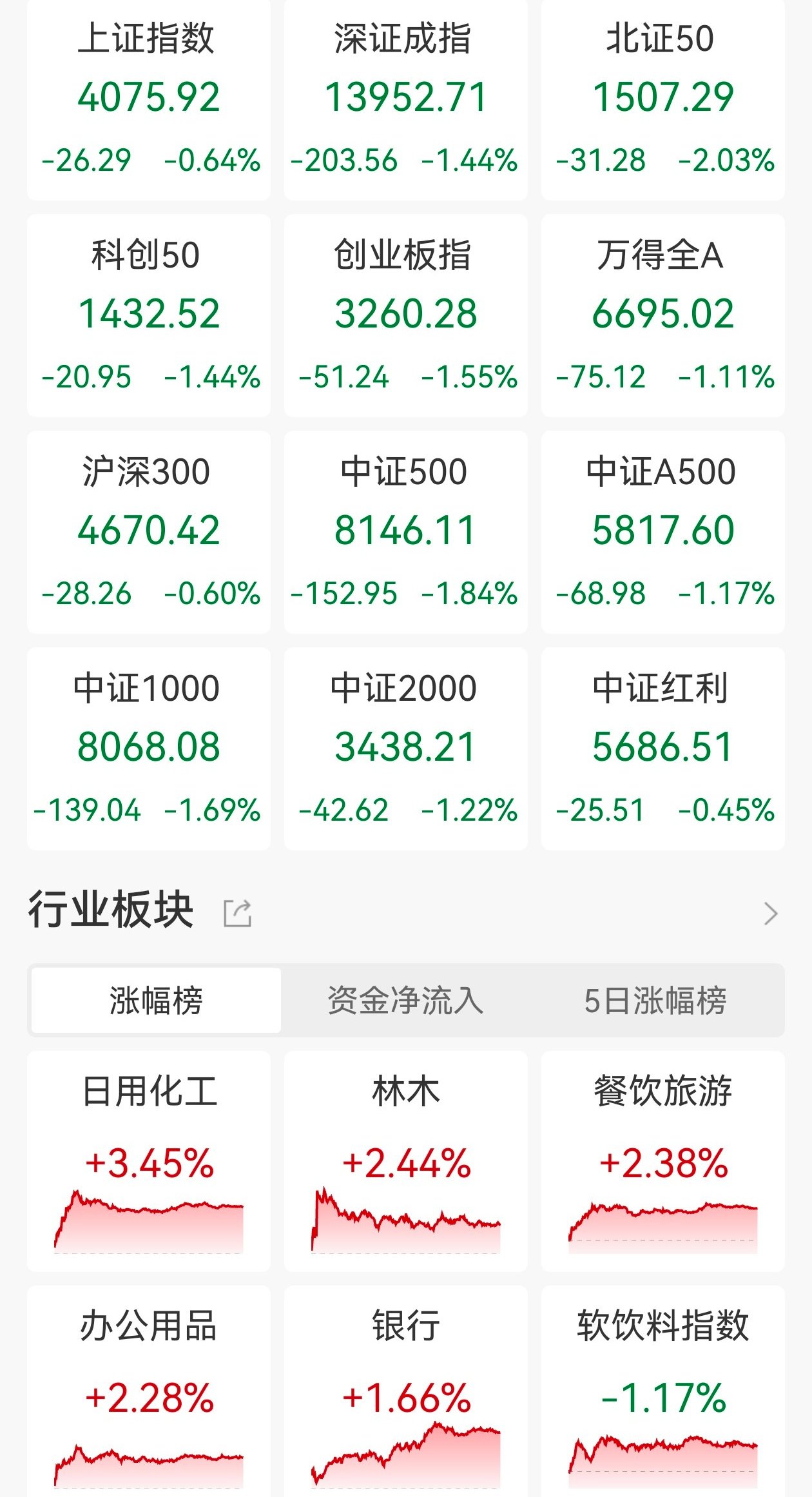 市场整体表现 - A股三大指数集体下跌,沪指跌0.64%报4075.92点,深证成指跌1.44%报13952.71点,创业板指跌1.55%报3260.28点 [1] - 全市场成交额2.19万亿元,较前一交易日缩量3090亿元 [1] - 超3700只个股下跌 [1] 下跌板块与概念 - 贵金属板块大幅下挫,湖南白银、四川黄金等多股跌逾9% [1] - 太空光伏概念股进入“冷静期”,钧达股份、双良节能等多股跌停 [1] - CPO概念走低,德科立跌逾11% [1] - 锂矿概念走弱,天齐锂业、赣锋锂业等多股跌逾6% [1] - 转基因、能源金属及培育钻石等板块跌幅居前 [1] 上涨板块与概念 - 大消费板块逆势走高,茂业商业、三江购物、三峡旅游、海欣食品等多股涨停 [1] - 美容护理板块拉升,拉芳家化涨停 [1] - 旅游酒店板块走强,三峡旅游涨停 [1] - 银行股活跃,厦门银行涨停 [1] - 商业百货、影视概念及纺织服装等板块涨幅居前 [1] 行业资金与涨幅表现 - 日用化工板块5日涨幅为+2.44% [2] - 林木板块5日涨幅为+3.45% [2] - 餐饮旅ं板块5日涨幅为+2.389% [2] - 银行板块5日涨幅为+2.28% [2] - 办公用品板块5日涨幅为+1.66% [2] - 软饮料指板块5日涨幅为-1.179% [2]