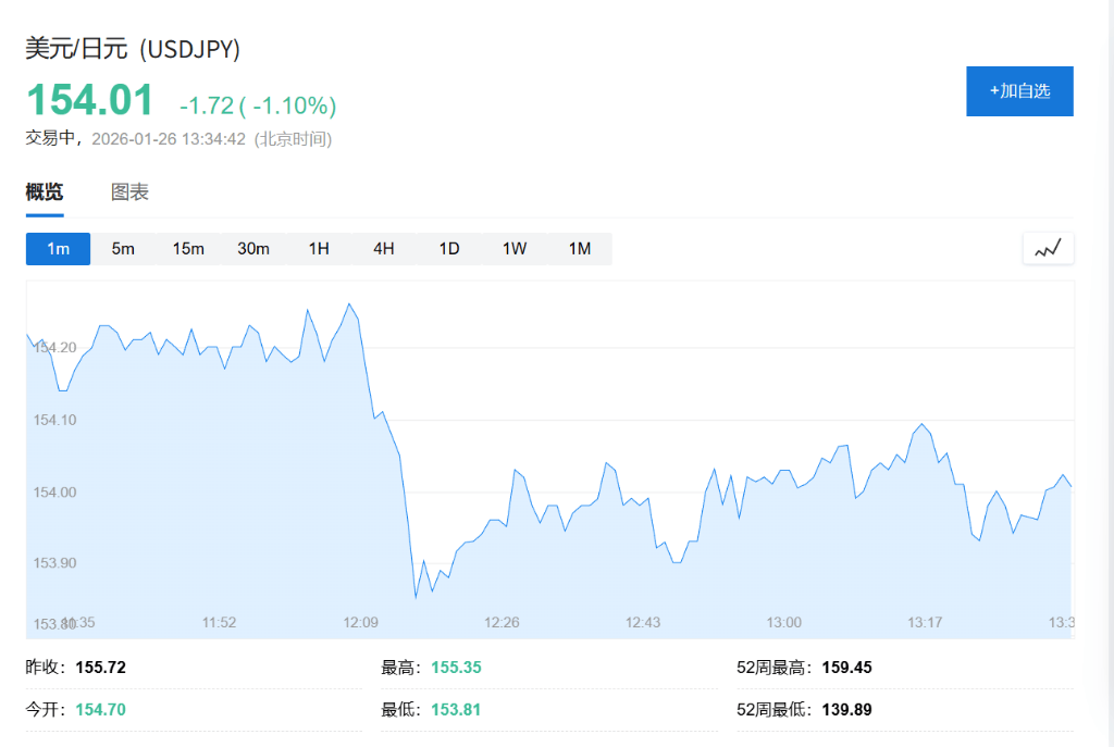 日本首相高市早苗周一就近期市场剧烈波动发出警告,承诺将监测投机性走势并在必要时采取行动。这是继上周末她表态将采取"一切必要措 施"应对异常波动后,再次对市场投机行为发出明确信号。 高市早苗26日在谈及市场走势时表示,市场波动背后有多种因素,但她强调将监测投机性走势,并在必要时采取行动。她透露,日本基本预算余 额28年来首次达到盈余。她表示将关注财政可持续性。 高市早苗还表示: "如果执政联盟无法赢得多数席位,我就不会担任首相。" 受消息影响,日元延续涨势,美元兑日元跌超1%,目前报154.01。,上周五市场出现剧烈震荡,美元兑日元汇率一度重挫约1.75%,日元创下五 个月来最大单日涨幅。市场普遍猜测,这一逆转的催化剂源自纽约联储极其罕见的"询价"(rate check)动作。 虽然高市在发表评论时表示,作为首相不便就"应由市场决定的事项"置评,但财务大臣片山皋月早已明确日本拥有"自由裁量权"在必要时采取行 动,包括干预市场。据报道援引交易员报告称,美联储纽约银行已联系金融机构询问日元汇率情况,加上财务大臣片山皋月与美国财长贝森特近 期密切沟通,暗示联合干预的可能性正在上升。道富环球投资管理高级固定收益策略师M ...