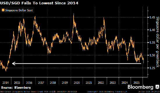 新加坡元汇率走势 - 新加坡元兑美元汇率攀升至1.2680,为2014年10月以来最高水平 [1][3] - 汇率上涨逾0.4%,主要受避险资金推动及美元承压影响 [1][3] - 美元承压部分源于市场猜测美国可能参与日本外汇市场干预行动 [1][3] 新加坡金融管理局政策预期 - 新加坡金融管理局预计将在本周会议上维持汇率政策区间不变 [1][3] - 政策维持不变的主要依据是核心通胀率保持稳定 [1][3] - 该央行主要政策工具是管理新加坡元名义有效汇率,而非利率 [1][3] 新加坡金融市场吸引力 - 新加坡凭借股息丰厚的股市、AAA级债券及稳定的政策吸引众多投资者 [1][3] - 新加坡海峡时报指数目前处于历史高位 [1][3] - 新加坡元在过去12个月内上涨约6% [1][3]