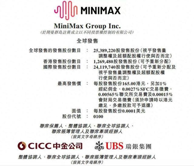 来源:智通财经 | 全球發售的發售股份數目 : 25,389,220股發售股份(視乎發售量 | | --- | | 調整權及超額配股權行使與否而定) | | 香港發售股份數目 : 1,269,480股發售股份(可予重新分配) | | 國際發售股份數目 :24.119,740股發售股份(可予重新分配及 | | 視乎發售量調整權及超額配股權 | | 行使與否而定) | | 最高發售價 : 每股發售股份165.00港元,另加1% | | 經紀佣金、0.0027%SFC交易徵費、 | | 0.00565%聯交所交易費及0.00015% | | 會財局交易徵費(須於申請時以港元 | | 繳是,多繳股款可予退還) | | 面值 : 每股發售股份0.0001美元 | | 股份代號 : 0100 | | 聯席保蘭人 ·整體協調人 ·聯席全球協調人 · | 上海大模型独角兽MiniMax正式启动招股。 12月31日,智通财经记者查阅招股书显示,MiniMax本次IPO拟发行2538.9万股,定价区间为151至165 港元/股,在不考虑发售量调整权及超额配股权行使的情况下,发行估值将介于461.23亿港元至503.99亿 港元之 ...