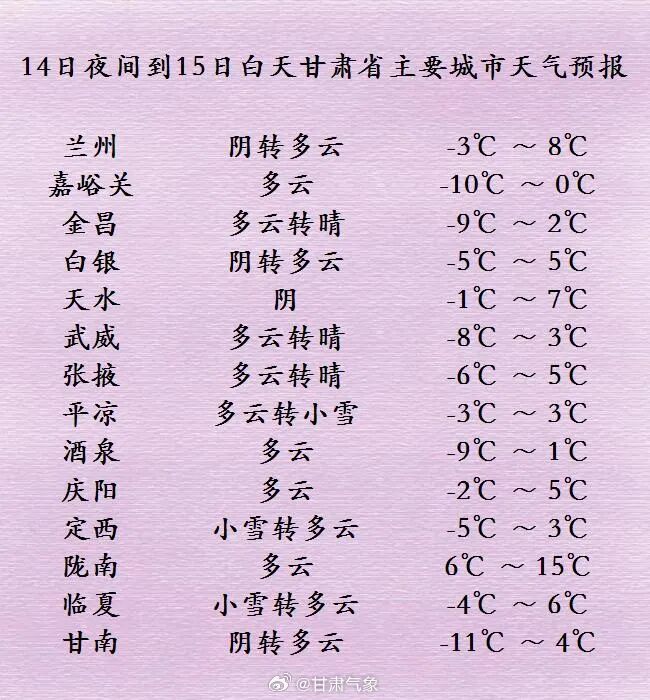 天气概况与趋势 - 2月14日至15日,省内自西向东有一次弱降温,全省大部气温继续下降[1][3] - 2月14日夜间至15日白天,河西五市多云或晴,酒泉、嘉峪关局部阴有小雪并伴有4-5级偏东风及沙尘,甘南、临夏、定西、陇南、天水、平凉等州市多云转阴,部分地方有小雪(雨)或雨夹雪,省内其余地方多云,局部阴有小雪[2] - 2月15日夜间至16日白天,全省各地晴或多云,祁连山区阴有小雪[4] - 2月16日夜间至17日白天,甘南、陇南两州市多云转阴,省内其余地方晴或多云,祁连山区阴有小到中雪[4] 主要城市具体预报 (2月14日夜间至15日白天) - 兰州:阴转多云,气温-3℃至8℃[5] - 嘉峪关:多云,气温-10℃至0℃[5] - 金昌:多云转晴,气温-9℃至2℃[5] - 白银:阴转多云,气温-5℃至5℃[5] - 天水:阴,气温-1℃至7℃[5] - 武威:多云转晴,气温-8℃至3℃[5] - 张掖:多云转晴,气温-6℃至5℃[5] - 平凉:多云转小雪,气温-3℃至3℃[5] - 酒泉:多云,气温-9℃至1℃[5] - 庆阳:多云,气温-2℃至5℃[5] - 定西:小雪转多云,气温-5℃至3℃[5] - 陇南:多云,气温6℃至15℃[5] - 临夏:小雪转多云,气温-4℃至6℃[5] - 甘南:阴转多云,气温-11℃至4℃[5] 兰州市三日天气预报 - 2月14日夜间至15日白天:阴转多云,气温-3℃至8℃[6] - 2月15日夜间至16日白天:多云转晴,气温-5℃至9℃[6] - 2月16日夜间至17日白天:晴转多云,气温-5℃至9℃[6]