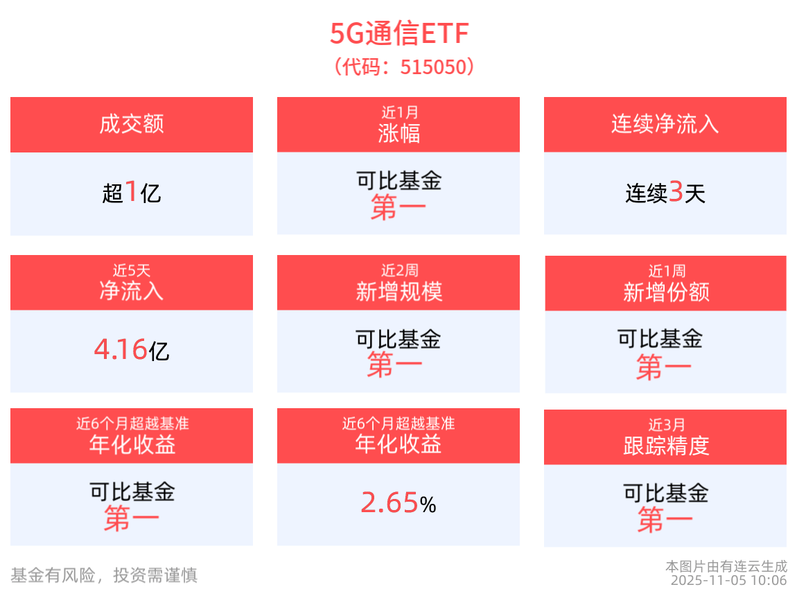 11月5日,受外盘情绪影响,A股主要指数低开回调,TMT算力板块重挫,截至10:06,中证5G通信主题指数(931079)下跌2.22%。成分股方面,兆易创新、 国博电子、东山精密领跌。5G通信ETF(515050)下跌2.48%,最新报价2.05元。拉长时间看,截至2025年11月4日,5G通信ETF近3月累计上涨52.62%,涨幅 排名可比基金第一。 5G通信ETF(515050),场外联接(华夏中证5G通信主题ETF联接A:008086;华夏中证5G通信主题ETF联接C:008087;华夏中证5G通信主题ETF联接D: 023765)。 以上内容与数据,与有连云立场无关,不构成投资建议。据此操作,风险自担。 数据显示,截至11月4日,5G通信ETF近3年净值上涨156.43%,指数股票型基金排名6/1906,居于前0.31%。从收益能力看,截至2025年11月4日,5G通信 ETF自成立以来,最高单月回报为37.75%,最长连涨月数为5个月,最长连涨涨幅为113.89%,涨跌月数比为39/34,上涨月份平均收益率为8.26%,年盈利百 分比为80.00%。截至2025年11月4日,5G通信ETF近6个月 ...