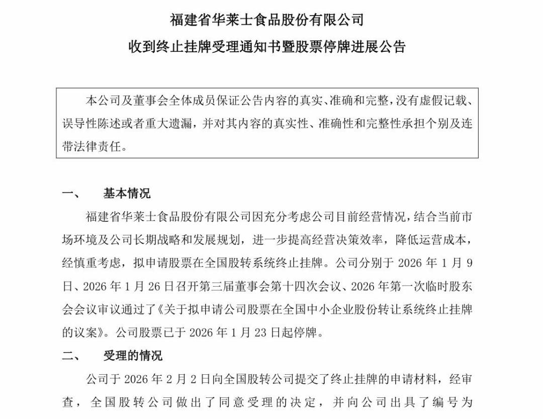 公司摘牌决策与官方解释 - 华士食品于2026年春节前夕正式启动新三板摘牌程序,申请已于2月2日提交并于2月4日获受理[1][2] - 公司官方给出的摘牌原因为“优化经营决策效率、降低运营成本”[5] 公司近期财务表现 - 2025年上半年,公司营收46.25亿元,同比微降0.49%,净利润1.22亿元,同比增长35.32%,经营活动现金流量净额3.07亿元,同比增长38.92%[5] - 2025年上半年毛利率为6.04%,较上年同期的5.13%有所提升,加权平均净资产收益率(按归母净利润计)为15.68%[6] - 2021年至2024年,公司营收保持增长,同比增速分别为64.44%、24.36%、23.45%、13.31%,净利润增速波动较大,分别为103.79%、-10.12%、52.99%、11.64%[6] 公司股权结构与财务细节 - 公司股权高度集中,普通股股东仅8人,其中华怀余、凌淑冰二人各持股32%,合计持股64%[7] - 截至2025年上半年,公司负债21亿元,资产负债率达73.73%[7] - 截至2025年6月30日,公司其他应付款同比激增7457.33%至1.06亿元,主要系应付股利增加1.04亿元[7] 公司业务模式与扩张历史 - 公司旗下品牌华莱士创立于2000年,主打“性价比”与“平价”策略,瞄准二三线及下沉市场[8] - 公司采用独创的“直营+门店众筹+员工合伙”模式进行扩张,极大激发了拓店积极性[10] - 2019年至2022年间,华莱士新增门店约1.4万家,拓店速度是肯德基、麦当劳的4-5倍,2023年门店数量峰值达20265家,超过肯德基、麦当劳、德克士、汉堡王四家门店数总和[10] 公司面临的食品安全挑战与应对 - 公司多次被曝出食品安全问题,例如2025年3月郑州地区门店被曝使用过期食材、伪造健康证;2024年广东门店汉堡吃出生肉,北京5家门店被消协点名等[10] - 公司应对措施包括发布致歉声明、关停涉事门店、开除责任人及启动全国门店安全自查,目前采用现场稽核+视频监控结合的方式进行多层监管,2025年1月总部抽查了7045家餐厅[12] 行业竞争环境与公司市场地位 - 当前餐饮品牌资本化加速,COMMUNE幻师、比格比萨、袁记食品等同行正冲刺港股上市[13] - 截至2025年12月,华莱士拥有19751家门店,仍稳居炸鸡汉堡品类门店数量榜首,下沉市场渠道优势稳固[13] - 塔斯汀等国潮汉堡品牌崛起,国际巨头加速下沉,正在稀释华莱士的低价优势[14] 公司经营压力与战略尝试 - 2025年上半年,公司营业成本高达43.45亿元,毛利率仅为6.04%,经营利润率3.76%,远低于餐饮行业10%-20%的平均毛利率,也大幅落后于百胜中国同期10.9%的经营利润率[14] - 公司近期在近万家门店试点“9.9元咖啡包月”活动,试图以极致低价吸引流量,带动门店主营业务消费[14] - 2025年上半年,公司用户体验中心人员扩招近20人至53人,是公司唯一大幅扩招的部门,显示公司正加大对终端用户体验的投入[16]