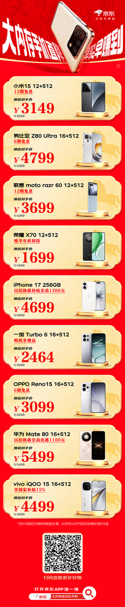 行业趋势与成本压力 - 行业内部人士透露,2026年受智能手机存储芯片采购成本压力影响,多家头部手机品牌已拟定于2025年3月初启动新一轮产品价格调整 [1] - 市场研究机构Counterpoint Research预计,2025年3月后中国市场新品手机均价将较2025年同档位机型上涨15%—25% [1] 主要品牌产品与促销信息 - 小米15 12GB+512GB预估到手价3149元,享12期免息 [2] - 努比亚Z80 Ultra 16GB+512GB预估到手价4799元,享6期免息 [2] - 联想moto razr 60 12GB+512GB预估到手价3699元,享12期免息 [2] - 荣耀X70 12GB+512GB预估到手价1699元,赠半年碎屏险 [2] - iPhone 17 256GB预估到手价4699元,享以旧换新至高补贴1300元 [2] - 一加 Turbo 6 16GB+512GB预估到手价2464元,购机享赠品 [2] - OPPO Reno15 16GB+512GB预估到手价3099元,享6期免息 [2] - 华为Mate 80 16GB+512GB预估到手价5499元,享以旧换新至高优惠1100元 [2] - iQOO 15 16GB+512GB预估到手价4499元 [2] 市场渠道与促销活动 - 京东平台提供“国补叠加以旧换新”活动,换新手机可享低至5折起的优惠 [1][5]