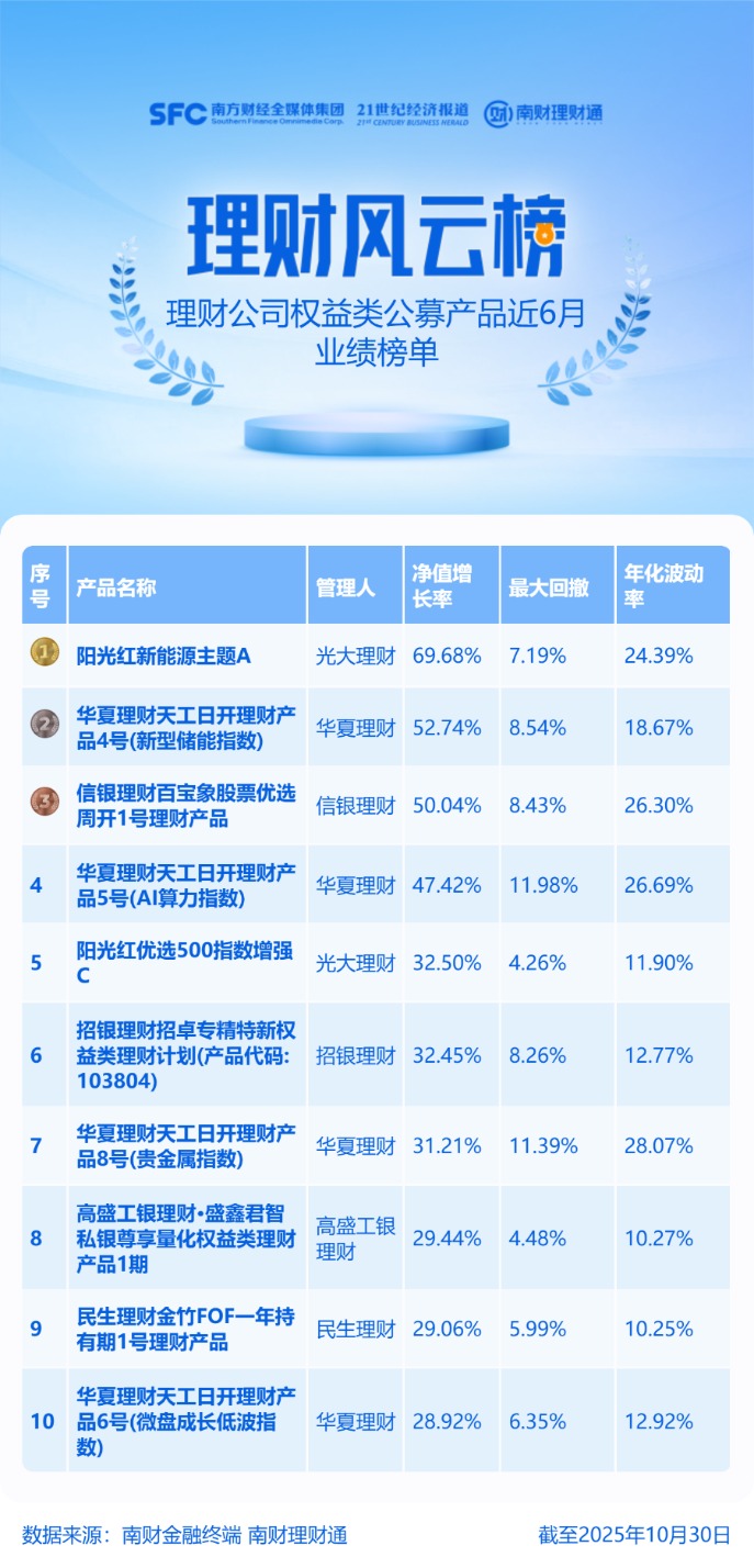 数据说明: 市场行情 10月最后一周,上证指数于10月28日突破4000点,这是沪指历史第三次突破这一关键点位,也是其最近10年来首次站上4000点整数关。10月29日沪指年内首 次收盘站上4000点,10月30日沪指盘中再创出新高4025.70点。 与此同时,市场情绪积极活跃。10月27日,A股两融余额达到2.48万亿元,其中,融资余额达到2.46万亿元,两者均创历史新高。 拉长时间看,近6个月(截至10月30日,下同),A股三大指数震荡走高,其中创业板指以超67%的涨幅领涨三大指数。 产品表现 产品统计范围为理财公司权益类理财公募产品,统计截止日期为2025年10月30日,统计区间为近6个月。 火热的行情下,权益类理财产品近6个月亦有不错表现。南财理财通数据显示,截至10月30日,近6个月,理财公司权益类公募理财近净值增长率均值为 23.65%,36只样本产品均录得正收益。其中有22只权益类理财产品净值增长率超20%,但中银理财"慧富权益类红利策略180天持有期A"、工银理财"工银财 富系列工银量化理财-恒盛配置理财产品"等7款产品净值增长率仅为个位数,收益率垫底。 本期榜单共有5家理财公司上榜。其中,华 ...