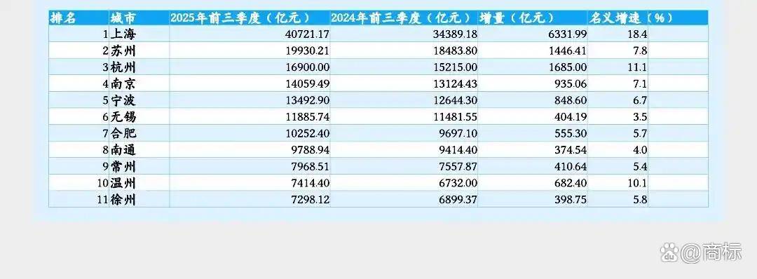 长三角地区作为中国经济的重要引擎,在政策红利与区位优势的双重加持下,2025年前三季度交出了一份亮眼成绩单。长三角一体化战略深入实施,创新驱 动与产业升级协同发力,推动区域GDP整体攀升。最新数据显示,前三季度长三角GDP10强城市排名出现微妙变化,苏州以近2万亿的经济体量稳坐第二, 合肥与无锡的差距进一步缩小,温州则凭借10.1%的高增速成为"黑马"。这场洗牌背后,是各城市如何借力地理禀赋、政策机遇与产业变革,实现高质量发 展的生动故事。 | 域市 | 2025年前三季度(亿元) | 2024年前三季度(亿元)增量(亿元) | | 名义增速 (%) | | --- | --- | --- | --- | --- | | 1上海 | 40721.17 | 34389.18 | 6331.99 | 18.4 | | 2苏州 | 19930.21 | 18483.80 | 1446.41 | 7.8 | | 3杭州 | 16900.00 | 15215.00 | 1685.00 | 11.1 | | 4南京 | 14059.49 | 13124.43 | 935.06 | 7.1 | | 5宁波 | 13492. ...