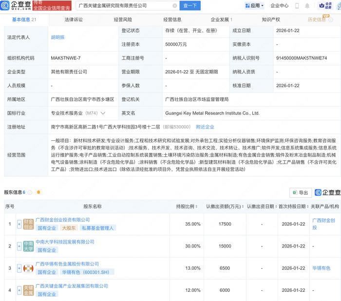 | 序号 | 股东名称 | 持股比例; | | 认缴出资额(万元) 。 认缴出资日期 : 首次持股日期 : 关联产品/机构 | | | --- | --- | --- | --- | --- | --- | | | 西财金创业投资有限公司 | 35.00% | 17500 | 2026-01-22 | 广西财金创 | | | 国有企业 大股东 私募基金管理人 | | | | 발 | | 2 | 中南大学科技园发展有限公司 | 30.00% | 15000 | 2026-01-22 | | | | 国有企业 | | | | | | 3 | 西华锡有色金属股份有限公司 | 13.00% | 6500 | 2026-01-22 | 华锡有色 | | | 国有企业 华锡有色(600301.SH) | | | | | | | "西关键金属产业发展集团有限公司 | 12.00% | 6000 | 2026-01-22 | | | | 图有企业 | | | | | 企查查APP显示,近日,广西关键金属研究院有限责任公司成立,注册资本5亿元,经营范围包含:新 材料技术研发;专业设计服务;工程和技术研究和试验发展;对外承包工程 ...