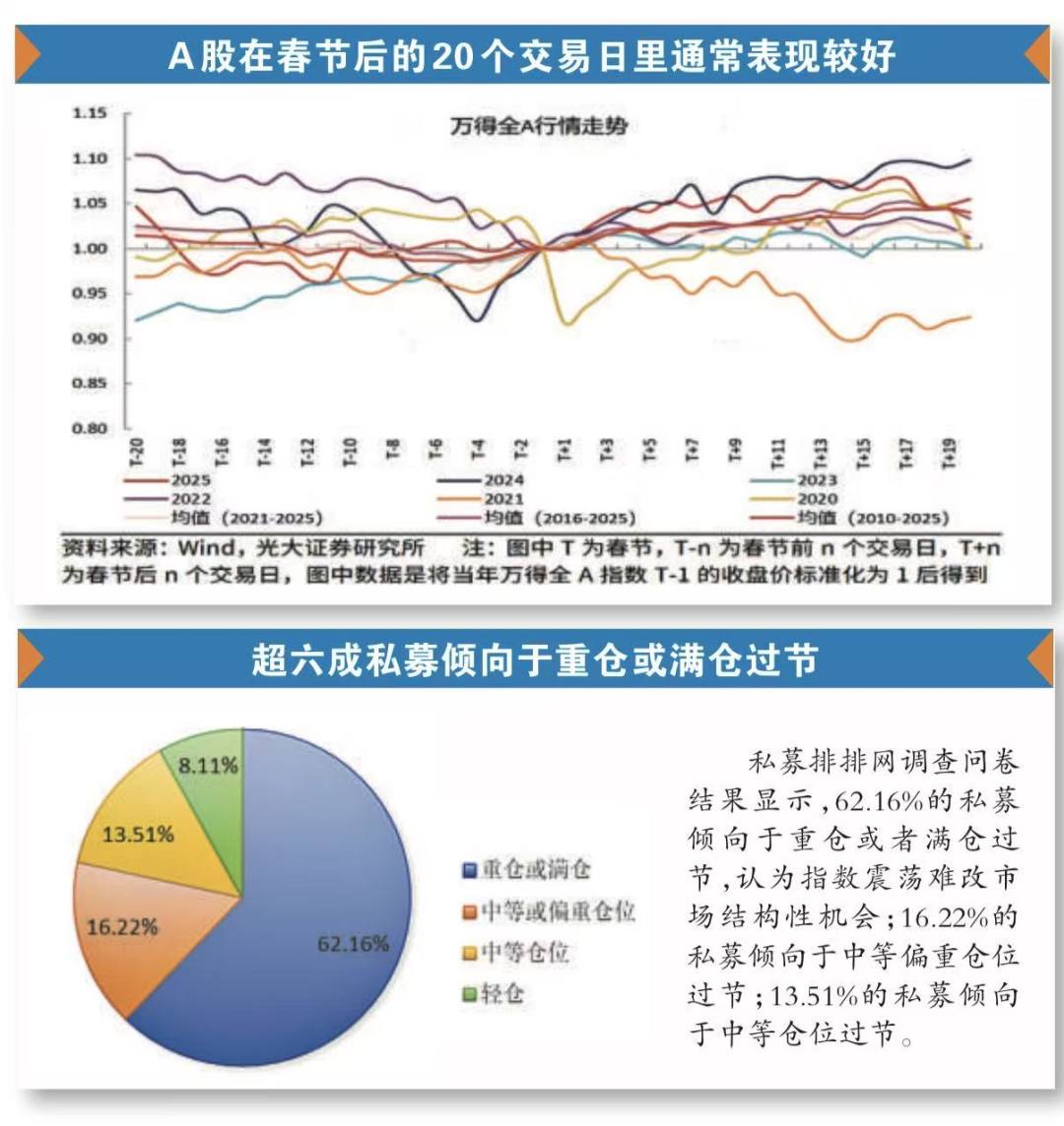 春节行情历史复盘与市场规律 - 对近20年A股市场复盘发现,春节前后存在明显的“日历效应”和“春节效应” [2] - 指数在春节前5个交易日左右通常开启趋势性反弹,行情一般持续至节后第6个交易日,其间呈趋势上行态势 [2] - 市场运行呈现“先下后上”规律,节前部分资金为规避长假不确定性离场导致市场走弱,而部分资金提前布局博弈节后反弹使反弹常出现在节前最后几个交易日 [2] 机构对当前春节行情的研判与建议 - 多家券商的主流建议是“持股过节”,理由基于对历史规律的复盘及对当前经济预期、流动性环境和风险偏好的综合评估 [2] - 光大策略团队认为春季行情值得期待,未来几个月政策和基本面有利好消息逐步验证,但春节前市场可能进入短暂震荡修正阶段 [3] - 华金证券策略团队认为春季行情未完,春节期间风险可能有限,支持持股过节,原因包括春节期间经济和盈利预期可能改善、流动性可能维持宽松 [3] 机构关注的具体投资方向与主题 - 东吴证券策略团队建议关注本轮调整中被过度定价的科技方向,包括国产芯片、半导体设备、存储芯片、算力通信和云计算 [3] - 同时建议关注景气方向,包括储能/锂电产业链、风电,以及周期涨价分支 [3] - 此外建议关注“十五五”规划相关主题,具体有商业航天与6G、核电、氢能、量子通信、脑机接口等新兴及未来产业 [3]