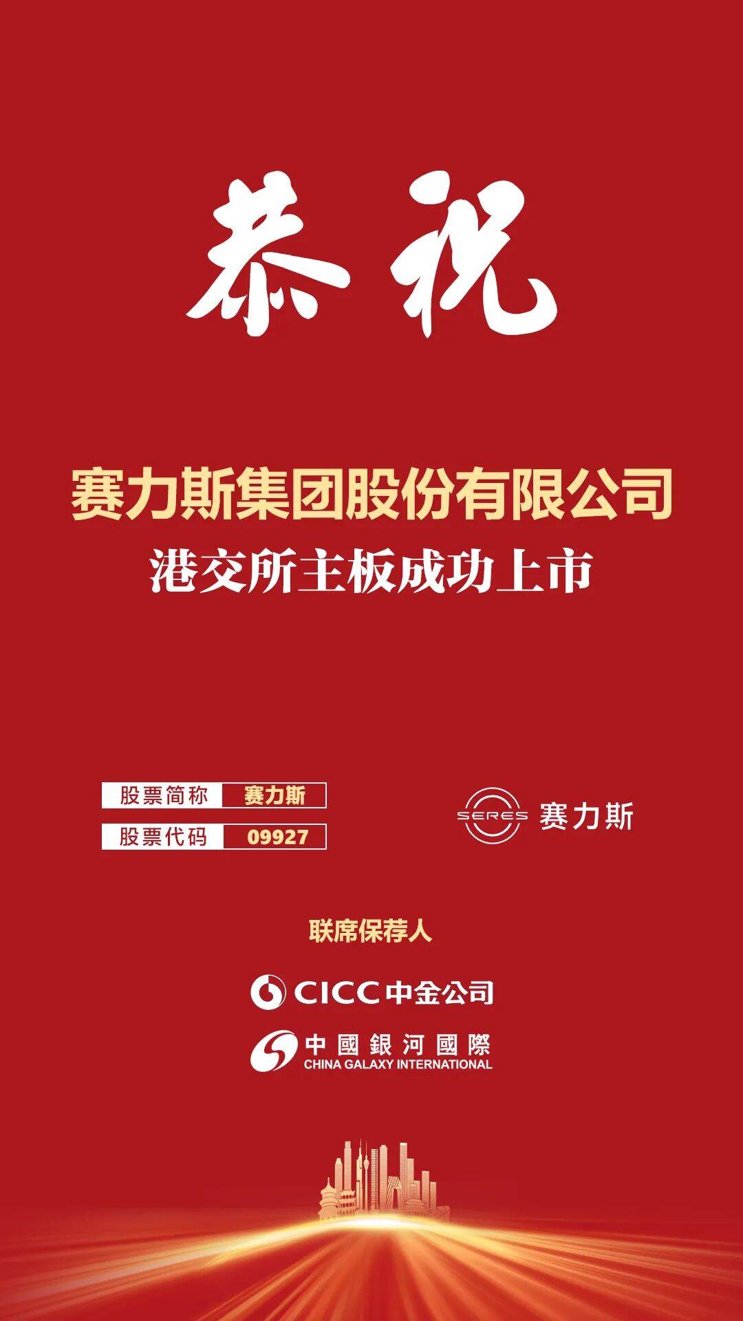 株 祝 Eres 赛力斯 联席保荐人 G CICC中金公司 中國 銀 河 國 際 中国上市公司网 赛力斯集团股份有限公司 港交所主板成功上市 股票简称 塞力斯 股票代码 09927 面向未来,新能源汽车行业的竞争将愈发聚焦于核心技术。赛力斯深谙此道,持续构筑深厚的技术护城河。公司倾力打造的魔方技术平台、超级增程、智 能安全等一系列先进技术,致力于实现硬件可升级、软件可迭代的智能化产品体验,精准契合了"软件定义汽车"的产业发展趋势。随着乘用车L2级及以上 智能驾驶渗透率的持续快速提升,预计2025年将达到70%,智能网联技术飞速演进,赛力斯在前沿技术领域的持续大规模投入,将为其在未来市场竞争中 赢得先机。同时,公司积极布局海外市场,此前通过欧洲万里行等专项测试积累了宝贵的实地经验,为后续的全球化战略推进奠定了坚实基础。 凭借产品矩阵焕新、技术创新深耕和经营效率提升等方面的卓越表现,赛力斯荣膺"2024年度金牛最具投资价值奖",并在2025年中国企业500强榜单中跃 居第190位,较上年提升270位,成为成长速度最快的企业之一。 此次登陆H股,其基石投资者阵容亦凸显多元资本背书的力量。公司与22名基石投资者签订投 ...