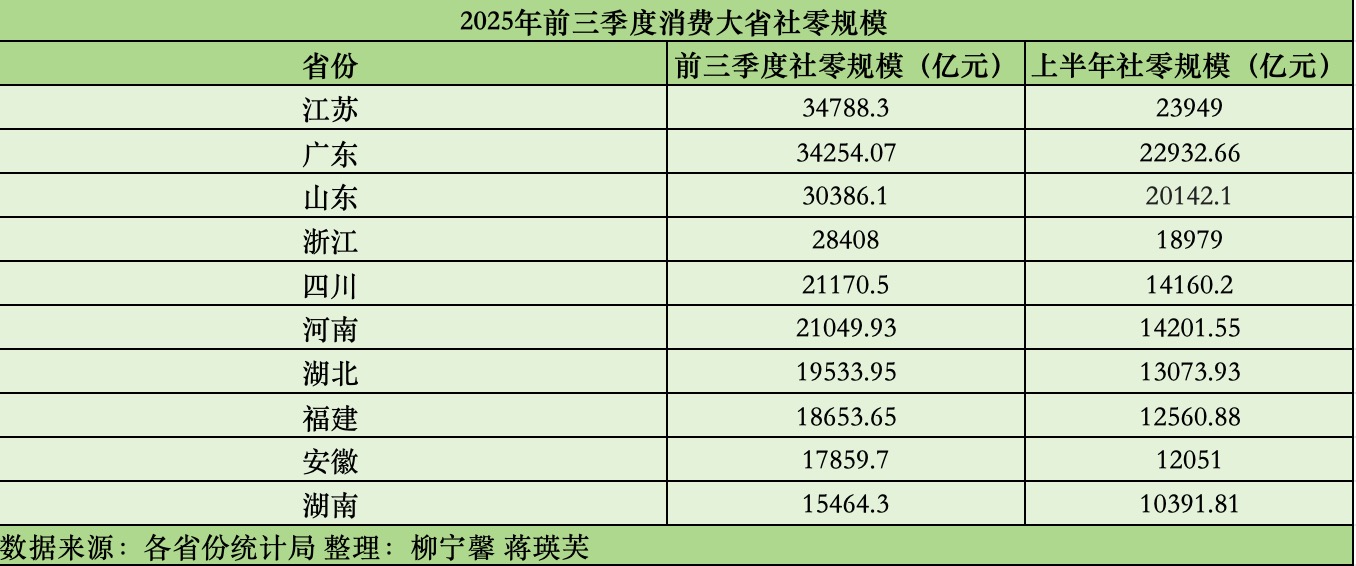 21世纪经济报道记者柳宁馨 报道 服务消费增长快于商品消费,乡村消费增速快于城镇消费,是当前中国消费结构优化的重要信号。 前三季度,我国中部、华南、西部不少省份社零增速表现突出。 前三季度,我国最终消费支出对经济增长贡献率达53.5%,比上年全年提升9个百分点。从社零总额看,前三季度,我国社会消费品零售总额365877亿元, 同比增长4.5%。 21世纪经济报道梳理31省份社零数据发现,前三季度,多数省份社零增速在4%—6%区间。除西藏尚未公布,前三季度,共有14个省份社零增速跑赢全国平 均水平,5个省份增速超6%,分别为海南、内蒙古、山西、河南、陕西。 | | 2025年前三季度消费大省社零规模 | | | --- | --- | --- | | 省份 | 前三季度社零规模(亿元) | 上来 | | 江苏 | 34788.3 | | | 广东 | 34254.07 | | | 山东 | 30386.1 | | | 浙江 | 28408 | | | 四川 | 21170.5 | | | 河南 | 21049.93 | | | 湖北 | 19533.95 | | | 福建 | 18653.65 | | | 安徽 ...