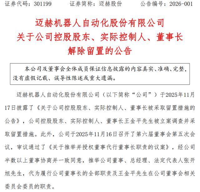 迈赫股份2025年11月16日晚间公告,公司于近日收到山东枣庄市薛城区监察委员会签发的《立案通知 书》和《留置通知书》,公司控股股东、实际控制人、董事长王金平被立案调查并采取留置措施。在王 金平被留置不能履行董事长职责期间,迈赫股份暂由公司董事、总经理、法定代表人张开旭代为履行公 司董事长职责。 公告一出,业内哗然。迈赫股份股价第二天也就是2025年11月17日大幅低开,至收盘跌7.42%,报23.34 元/股,此后一度调整至20.46元。虽然今年1月8日短暂冲高至25元上方,但至收盘涨幅收窄。其最新股 价为24.2元,仍未恢复至公告之前25.21元的股价水平。而元旦后沪指接连上涨,频创10年来新高。 一纸公告,消除了迈赫股份(301199)历时50多天的"掌门人失去自由"的危机。 公开资料显示,王金平出生于1966年,复旦大学数学系计算数学专业本科、计算机系软件工程专业硕士 研究生毕业。他在2009年投资设立山东迈赫投资有限公司,担任该公司执行董事兼总经理;2010年1 月,迈赫投资等股东发起成立迈赫股份。2017年9月至今,王金平担任公司董事长。 迈赫股份1月9日盘后公告,1月9日,公司收到枣庄市薛城区监 ...