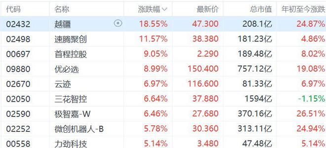 港股机器人概念股集体上涨,越疆(02432.HK)上涨18%,速腾聚创(02498.HK)涨超9%,优必选(09880.HK)涨6.3%,云迹(0267...