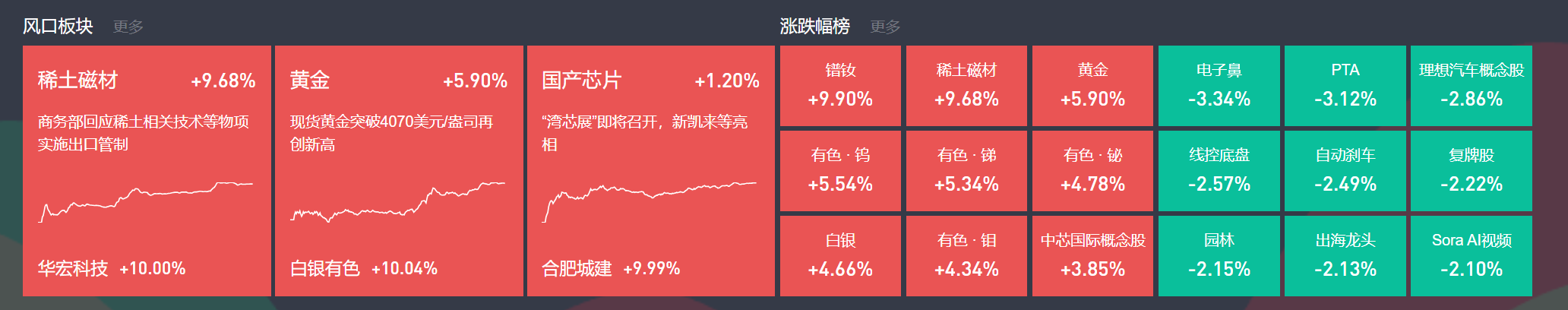此外,10月9日,包钢股份公告,拟将2025年第四季度稀土精矿关联交易价格调整为不含税26205元/吨(干量,REO=50%)。 二、当日热点 1.稀土磁材 10月10日,北方稀土公告,2025年第四季度稀土精矿交易价格调整为不含税26205元/吨,环比上涨37.13%;预计今年前三季度实现归母净利润15亿元至15.7 亿元,同比增加272.54%到287.34%;实现扣非净利润13.3亿元至13.9亿元,同比增加399.90%到422.46%。 一、行情回顾 市场全天低开回升,三大指数小幅下跌。稀土概念股集体爆发,中国稀土、北方稀土等十余股涨停。黄金股午后走强,西部黄金、白银有色等封板。可控核 聚变反复活跃,合锻智能、永鼎股份等涨停。半导体产业链低开高走,华虹公司、路维光电等封板。下跌方面,机器人概念股调整,首开股份跌停。个股跌 多涨少,沪深京三市约3700股飘绿,今日成交2.37万亿。 稀土磁材概念今日大涨,华宏科技、北方稀土、新莱福、包钢股份等多股涨停。 催化上,10月9日,商务部发布三条公告,分别对部分中重稀土及其相关物、部分稀土设备和原辅料相关物以及稀土相关技术实施出口管制。 稀土磁材 商务部回应稀 ...