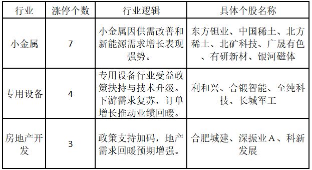 每经记者|闫峰峰 每经编辑|何建川 各位投资者,大家好。 涨跌停板数据,不仅是反映板块和个股强弱的指标,更是市场情绪与资金流向的重要标志。那么,今日 的涨停个股有哪些特点呢?哪些涨停股又值得重点关注?欢迎大家关注微信公众号"道达号",其"道达 涨停复盘"栏目为大家解读。 从行业特征来看,今日涨停板个股中,小金属、专用设备、房地产开发行业的个股最多。 (注:行业涨停板个股越多,说明该行业被资金重点关注,是当前热门行业。) 从概念特征来看,今日涨停板个股中,稀土磁材、核聚变、固态电池概念的个股最多。 | 概念 | 涨停个数 | 概念逻辑 | 具体个股名称 | | --- | --- | --- | --- | | 稀土磁材 | 9 | 出口管制题材,稀土 | 中国稀土、包钢股份、北方 稀土、北矿科技、华宏科技 | | | | 磁材供不应求。 | 、广晟有色、惠城环保、新 | | | | | 来福、银河歯体 | | | | 核聚变技术突破预 | 东方银业、合锻智能、安泰 | | 核景变 | 7 | 期,政策支持加速产 | 科技、旭光电子、永鼎股份 | | | | 11.16. | 、王子新材、联创光电 | | 固态 ...