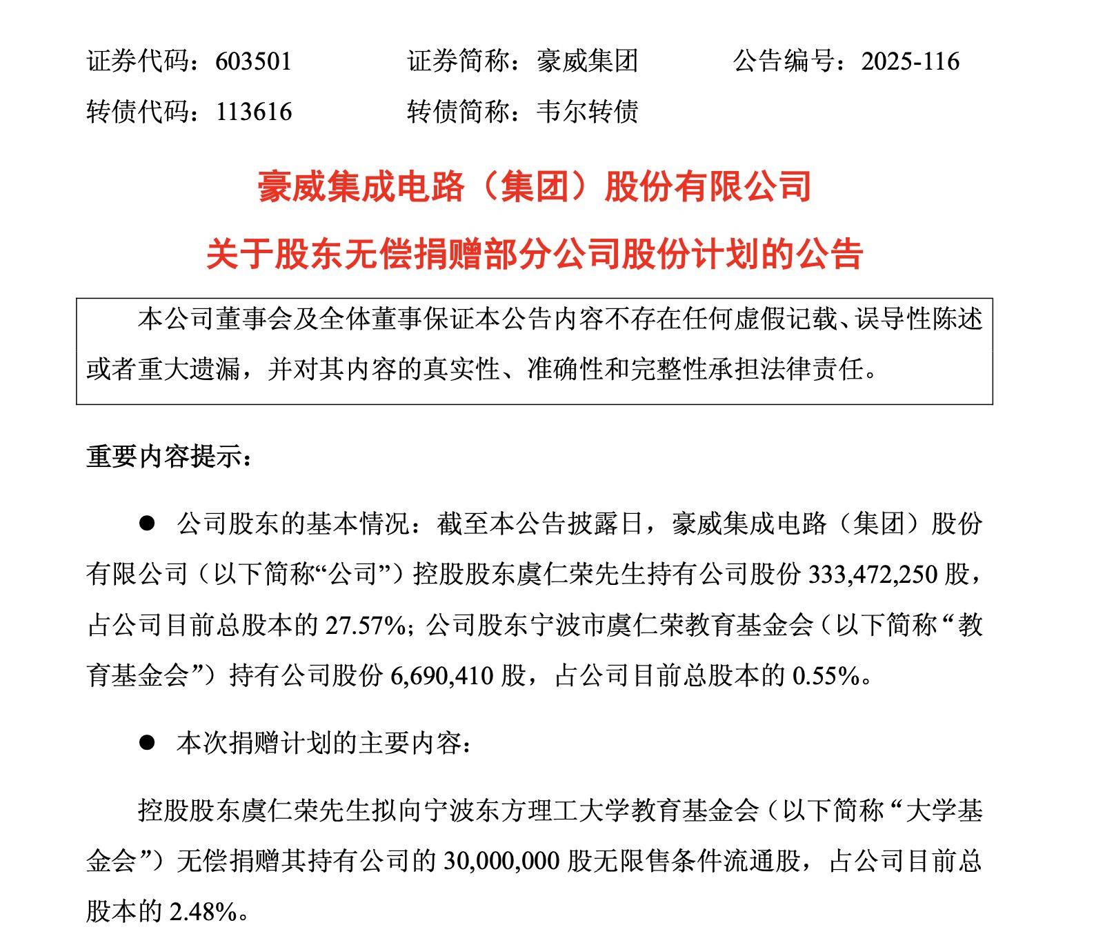 控股股东捐赠 - 控股股东虞仁荣拟向宁波东方理工大学教育基金会无偿捐赠3000万股无限售条件流通股,占公司总股本的2.48% [1] - 股东宁波市虞仁荣教育基金会拟向大学基金会无偿捐赠60万股无限售条件流通股,约占公司总股本的0.05% [1] 公司基本信息 - 公司证券代码为603501,证券简称为豪威集团,转债代码为113616,转债简称为韦尔转债 [2] - 公司前身为韦尔股份,证券简称于2025年6月20日起由“韦尔股份”变更为“豪威集团”,公司名称已变更为豪威集成电路(集团)股份有限公司 [5] 公司财务业绩 - 第三季度实现营业收入78.27亿元,同比增长14.81%,归属于上市公司股东的净利润11.82亿元,同比增长17.26% [6] - 前三季度实现营业收入217.83亿元,同比增长15.20%,归属于上市公司股东的净利润32.10亿元,同比增长35.15% [6] - 业绩增长得益于公司在汽车智能驾驶领域渗透率快速提升,以及在智能影像终端应用市场的显著扩张 [6] - 通过优化产品结构和供应链管理,公司毛利率持续改善 [6] 受赠方信息 - 宁波东方理工大学是一所由社会力量举办、国家重点支持的新型研究型大学,于2024年6月19日获教育部批复设立 [7] - 学校以服务国家发展、推动社会进步为使命,强化基础研究、聚焦前沿交叉、突出工程技术 [7]