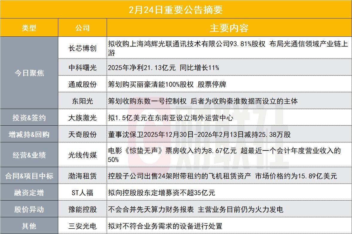 今日聚焦:并购与战略布局 - 长芯博创拟收购上海鸿辉光联通讯技术有限公司93.81%股权,以布局光通信领域产业链上游 [1] - 通威股份筹划购买丽豪清能100%股权,股票因此停牌 [1] - 东阳光筹划收购东数一号控制权,该主体是为收购秦淮数据而设立 [1] - 开普云终止收购致力于生产高端存储产品的南宁泰克100%股权事项 [1] 今日聚焦:经营业绩 - 中科曙光2025年净利润为21.13亿元,同比增长11% [1] - 光线传媒电影《飞驰人生3》累计票房收入约29.26亿元,公司来源于该影片的营业收入约为4300万元至5300万元 [1] - 光线传媒另一部电影《惊蛰无声》票房收入约为8.67亿元,超过公司最近一个会计年度营业收入的50% [1][7] - 嘉泽新能表示其绿色化工业务尚处于起步阶段,尚不具备商业化条件 [1] 投资与签约 - 大族激光计划投资1.5亿美元在东南亚设立海外运营中心,以拓展海外业务 [2] - 韶能股份全资子公司与元碳公司签订独立储能电站项目用地及电厂资源合作协议,总金额为2200万元 [3] - 中国天楹控股子公司获得越南河内市垃圾发电厂扩建项目批文,扩建规模为1600吨/天,发电容量45MW,投资额约2.20亿美元 [10] 增减持与回购 - 中国核建股东中国信达在2025年11月19日至2026年2月18日期间减持803.54万股 [4] - 天奇股份董事沈保卫在2025年12月30日至2026年2月13日期间减持25.38万股,占公司总股本的0.0631% [1][4] - 红宝丽副总经理陶梅娟计划减持不超过31万股,占公司总股本不超过0.04% [5][6] - 海螺水泥控股股东海螺集团计划增持公司股份,金额为7亿元至14亿元 [7] 经营与业绩 - 温氏股份2025年净利润同比下降44%,主要因生猪销售价格同比大幅下降导致生猪养殖业务利润下降 [7] - 甬矽电子2025年净利润为8224万元,同比增长23.99% [7] - 微导纳米2025年净利润为2.13亿元,同比下降6.12% [7] - 交控科技2025年净利润同比增长86.13% [7] - 斯瑞新材2025年净利润同比增长35.04% [7] - 三生国健2025年净利润同比增长317.09% [7] - 幸福蓝海来源于《飞驰人生3》和《熊出没:年年有熊》两部影片的营业收入共计约为79万元至102万元 [7] - 华智数媒电影《惊蛰无声》累计票房收入超9亿元,超过最近一个会计年度营业收入的50% [7] - 祥源文旅2026年春节假期接待游客114.28万人次,实现营业收入7092.37万元 [7] 合同与资产处置 - 渤海租赁控股子公司出售24架附带租约的飞机租赁资产,市场价格约为15.89亿美元(约合人民币110.61亿元) [1][7] 融资与定增 - ST人福拟向控股股东定向增发募集资金,总额不超过35亿元 [1][8] 股价异动澄清 - 豫能控股发布异动公告,澄清公司仅参股投资先天算力,不会合并其财务报表,也不会参与其具体运营,公司主营业务目前仍为火力发电 [1][8] 其他公司动态 - 三安光电拟对不符合业务需求的设备进行处置,该批设备账面净值4.47亿元,占公司近期固定资产账面净值的比例约为1.9% [1][9] - 怡达股份控股子公司泰兴怡达取得年产20万吨环氧丙(乙)烷衍生产品项目备案证 [10] - 内蒙华电拟变更证券简称为“华能蒙电” [11] - 白银有色获得政府补助900万元 [11]