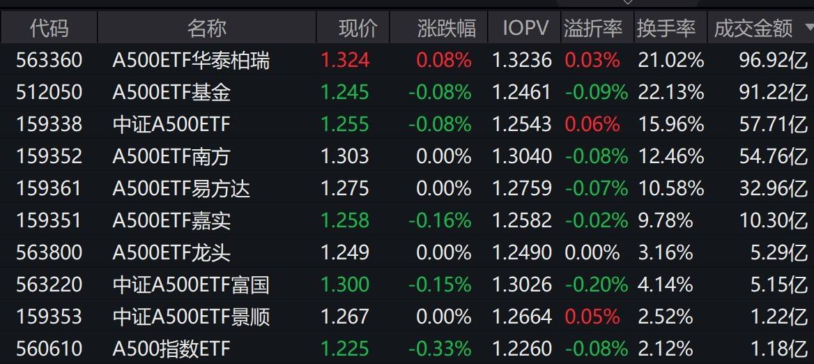 市场早盘探底回升,创业板指震荡翻红,中证A500指数上涨0.01%。从板块来看,贵金属概念延续强势,半导体设备股震荡反弹,CPO概念表现活跃;下跌 方面,电池产业链集体下挫。 每日经济新闻 有券商表示,中期来看,仍维持"短期宜顺应趋势,积极把握从2025年12月中旬到2026年3月初的做多窗口期"的判断,预计当前上行趋势仍未逆转。 | 代码 | 名称 | 现价 | 涨跌幅 IOPV 溢折率 换手率 | 成交台 | | --- | --- | --- | --- | --- | | 563360 | A500ETF华泰柏瑞 | 1.324 | 0.08% 1.3236 0.03% 21.02% | 96. | | 512050 | A500ETF基金 | 1.245 | -0.08% 1.2461 -0.09% 22.13% | 91. | | 159338 | 中证A500ETF | 1.255 | -0.08% 1.2543 0.06% 15.96% | 57. | | 159352 | A500ETF南方 | 1.303 | 0.00% 1.3040 -0.08% 12.46% | 54. | | 159 ...