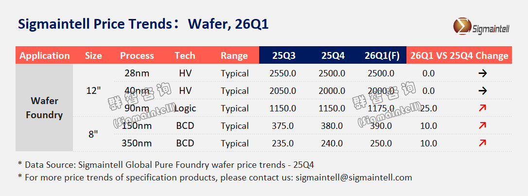 群智咨询发布2026年Q1晶圆代工价格风向标:预计55/90nm将迎来普涨