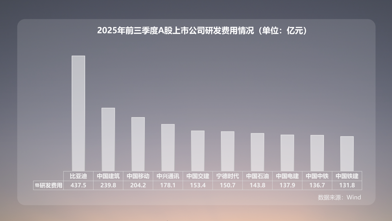 公司财务表现 - 前三季度营收达5662.7亿元,同比增长13% [1] - 前三季度研发费用为437.5亿元,同比增长31%,比同期净利润高出205亿元 [1] - 今年第三季度毛利率环比上升1.6个百分点 [8] - 10月份销量达441,706辆,创下年内新高 [9] 研发投入与战略 - 公司在A股5400多家上市公司中研发投入排名第一,较第二名的领先优势扩大至近200亿元 [3] - 研发投入超过国内多家头部车企之和,较特斯拉同期研发投入高出109亿元 [3] - 研发投入的31%增幅在行业整体加大研发力度的背景下依然独树一帜 [5] - 累计研发投入已超过2200亿元,在2011年至2025年的近15年间有14年的研发投入都超过了当年净利润 [5] - 公司通过“研发优先”的长期主义构筑核心竞争力 [3][5] 技术成果与产品创新 - 2025年初推出的天神之眼辅助驾驶系统,截至9月累计搭载车型销量已突破170万辆 [6] - 公司为智能泊车场景的安全及损失提供“全面兜底”承诺 [6] - 从超级e平台兆瓦闪充到灵鸢车载无人机系统,研发投入在多个技术维度开花结果 [8] - 公司在全球累计申请专利超6.5万项 [8] 全球化进展与市场表现 - 前三季度海外销量达70.16万辆,同比激增132% [8] - 在东京车展上全球首发了针对日本K-car市场的K-EV BYD RACCO车型,并推出“纯电+混动”双线策略 [8] - 针对欧洲严苛安全标准进行多项技术适配,形成“研发驱动型出海”模式 [8] - 技术溢价在海外市场兑现,助力利润空间突破 [8] 行业地位与未来展望 - 公司的“研发之王”战略着眼于全球技术格局的重构 [9] - 在新能源汽车行业从电动化转向智能化的关键时点,公司通过前瞻性研发布局赢得了宝贵的先发优势 [9] - 公司的“研发驱动”模式随着技术红利在海外市场释放和创新成果落地,或将迎来更大的价值重估 [10]