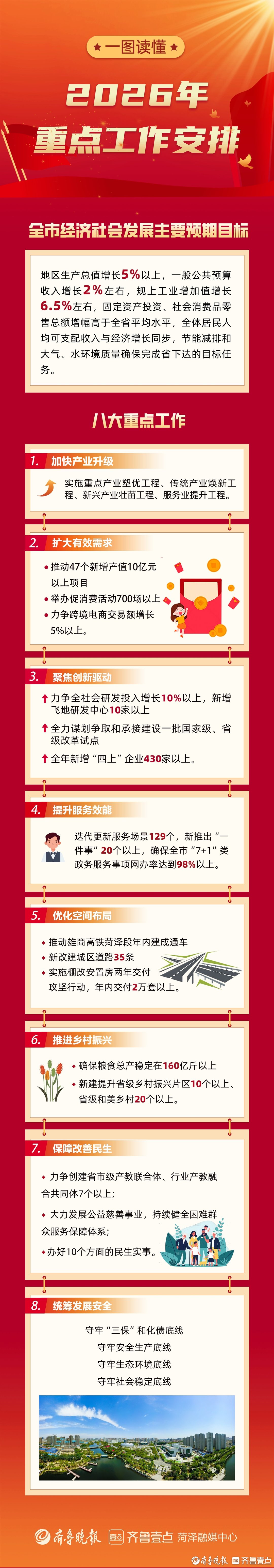 齐鲁晚报齐鲁壹点李潇 2026年菏泽市经济社会发展重点工作安排正式发布,明确了全年发展的核心方向与关键任务。围绕产业升级、需求扩大、创新驱动等八大领域,菏泽从产 业培育、基建完善、民生保障等维度制定具体举措,以系统规划推动经济社会高质量发展,让发展蓝图转化为实实在在的建设成效。 / \大重点工作 加快产业升级 7 . 实施重点产业塑优工程、传统产业焕新工 程、新兴产业壮苗工程、服务业提升工程。 2. 扩大有效需求 ● 推动47个新增产值10亿元 以上项目 ● 举办促消费活动700场以上。 ● 力争跨境电商交易额增长 5%以上。 3. 聚焦创新驱动 ↑ 力争全社会研发投入增长10%以上,新增 飞地研发中心10家以上 ↑全力谋划争取和承接建设一批国家级、省 级改革试点 ↑ 全年新增"四上" 企业430家以上。 提升服务效能 迭代更新服务场景129个,新推出"一 件事" 20个以上,确保全市"7+1″ 类 政务服务事项网办率达到98%以上。 5. 优化空间布局 ◆ 推动雄商高铁菏泽段年内建成通车 ◆ 新改建城区道路35条 ◆ 实施棚改安置房两年交付 攻坚行动,年内交付2万套以上 推进乡村振兴 6. ◆ 确保粮食总产 ...