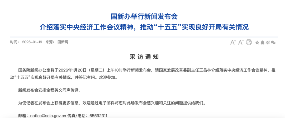 经济观察网据央视新闻客户端消息,国务院新闻办公室将于2026年1月20日(星期二)上午10时举行新闻 发布会,请国家发展改革委副主任王昌林介绍落实中央经济工作会议精神,推动"十五五"实现良好开局 有关情况,并答记者问。 国务院新闻办公室将于2026年1月20日(星期二)下午3时举行新闻发布会,请财政部副部长廖岷介绍发挥 积极财政政策作用,推动经济社会高质量发展有关情况,并答记者问。 ...