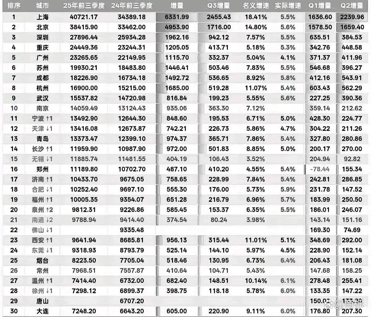 宏观政策精准发力与区域发展战略的持续深化,共同铸就了2025年前三季度中国经济的韧性增长。最新出炉的GDP30强城市榜单,不仅是一张成绩单,更是 一幅描绘区域经济活力、产业转型成效与内生动力强弱的动态图谱。上海、北京、深圳继续以绝对优势领跑,总量均突破2.5万亿元,展现了头部城市的强 大引擎作用。然而,榜单中部的竞争尤为激烈,名次的微妙变化揭示了城市经济发展的新趋势,其中杭州的稳健跨越、长沙的强势进位以及烟台的速度优 势,成为本轮"洗牌"中最引人注目的亮点。这些变化背后,究竟是怎样的发展逻辑在驱动?让我们一同解码。 | 指导 | 板布面 | 25年前三季度 | 24年前三季度 | 增量 | Q5增量 | 名义增速 | 延陸禮透 | Q191 | | --- | --- | --- | --- | --- | --- | --- | --- | --- | | 1 | 工溶 | 40721.17 | 34389.18 | 6331.99 | 2455.43 | 18.41% | 5.5% | 1636.60 | | 2 | 北京 | 38415.90 | 33462.00 | 4953.90 | 1716.00 ...
