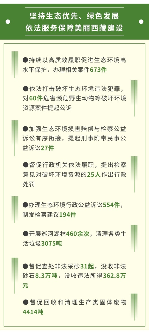 依法服务保障美丽西藏建设的检察履职成效 - 西藏检察机关2025年深入贯彻落实相关法律法规,以高质效履职促进生态环境高水平保护,全年办理相关案件673件 [1][2] - 依法打击破坏生态环境违法犯罪,对60件危害濒危野生动物、盗伐滥伐林木、非法采矿等破坏环境资源案件提起公诉 [1][2] - 加强生态环境损害赔偿与检察公益诉讼衔接,提起刑事附带民事公益诉讼27件 [1][2] - 督促行政机关依法履职,提出检察意见对破坏环境资源的25人作出行政处罚 [1][2] 生态环境公益诉讼检察工作 - 深化生态环境公益诉讼检察,2025年办理行政公益诉讼554件,制发检察建议194件 [1][2] - 开展巡河湖林活动460余次,督促清理污染和非法占用河道2.3公里、各类生活垃圾3075吨 [1][3] - 督促查处非法采砂31起,没收非法砂石8.3万吨,没收违法所得362.8万元 [1][3] - 督促回收和清理生产类固体废物4414吨 [1][3] 生物多样性保护与专项监督行动 - 针对高原生物多样性保护开展监督,例如昌都市、波密县检察院就黄喉雉鹑、棕背黑头鸫、藏猕猴等动物受侵害情况依法监督 [2] - 有效防范外来物种入侵,墨脱县检察院督促清理喜旱莲子草1300余平方米、5000余株 [2] - 会同水利、公安等部门开展河道非法采砂专项整治行动 [3] - 协同生态环境等部门开展非法倾倒处置固体废物专项整治行动 [3] 协同共治与机制建设 - 持续深化协同共治,与生态环境、林草等部门建立行政执法与刑事司法衔接机制和行政执法与公益诉讼检察工作衔接机制4项 [3] - 工作报告中关于坚持生态优先、绿色发展的工作成效,得到西藏自治区人大代表们的广泛关注和充分肯定 [2]