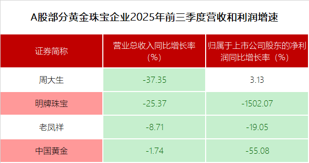 近年来金价的高企和剧烈波动,催生了新一轮黄金投资热潮,也对黄金产业链的企业产生 了 明显影响。 因金价高涨和剧烈波动,一些企业也在积极探寻应对之道,以实现稳健经营和持续增长。 高金价之下的产业链冲击 近年来金价的高企和剧烈波动,对黄金产业链企业产生了不同的影响。 一方面,对于黄金产业链上游金矿类企业而言,金价的上涨利于增厚其业绩,这一点从不久前披露的金矿类上市企业三季报数据能得到验证。 Wind数据显示,在申万行业分类下,黄金行业上市公司2025年前三季度营业收入和归属于上市公司股东的净利润全部同比实现增长,这些公司主要是上游 的金矿类公司。其中招金黄金、西部黄金2025年前三季度营业收入和归属于上市公司股东的净利润同比增速均超过100%。 另一方面,金价的大幅上涨,对于下游黄金珠宝类企业的影响则是另外一番光景,行业内不少企业今年前三季度业绩同比下滑。比如,周大生、明牌珠宝、 老凤祥、中国黄金等上市黄金珠宝企业2025年前三季度营业收入同比均不同程度下滑,其中明牌珠宝、老凤祥、中国黄金2025年前三季度归属于上市公司 股东的净利润同比也出现下滑。 | 证券简称 | 营业总收入同比增长率 (%) | 归属于上市 ...