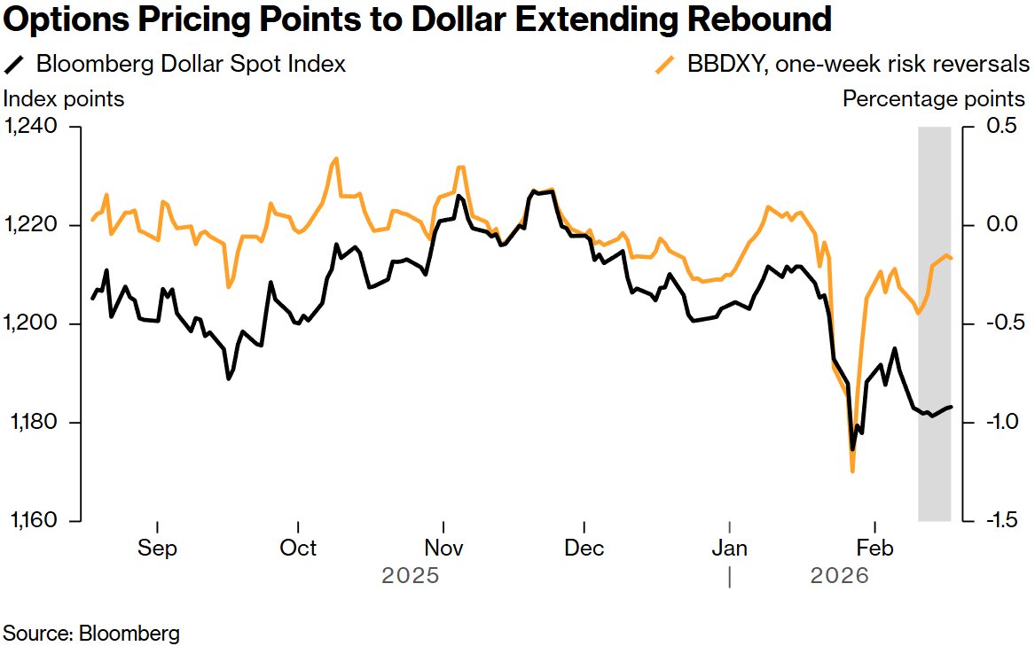美元汇率走势 - Bloomberg美元现货指数上涨0.1%,尽管日元走强约0.4%,但货币篮子中其他货币下跌支撑了指数高位 [1] - 期权市场显示对美元的短期看跌情绪缓解,近端风险逆转指标处于近一个月来负值程度最低水平 [1] - 对冲基金在周二活跃地削减了美元空头头寸 [4] 市场对美联储的利率预期 - 货币市场预计美联储到2024年底将降息约64个基点,这相当于约三次降息 [1] - 部分策略师认为当前市场对三次降息的预期过于激进,超出了经济数据所能支持的范围 [1] - 丹麦银行分析师预计美联储将在6月和9月降息,随后将利率维持在3.00%-3.25%的区间直至2027年,强于预期的1月就业报告削弱了春季进行额外“保险式降息”的理由 [4] 影响市场预期的核心因素 - 有观点认为联邦基金利率的降息押注过度,为短期内推升美元的重新定价留下了空间,理由是具有韧性的增长以及核心通胀停留在美联储2%目标之上 [1] - 市场在美联储会议纪要和周五个人消费支出(PCE)数据公布前缺乏明确宏观催化剂,投资者有空间进行头寸调整 [4] - 随着美伊核谈判新一轮临近,地缘政治风险再次成为关注焦点 [4]