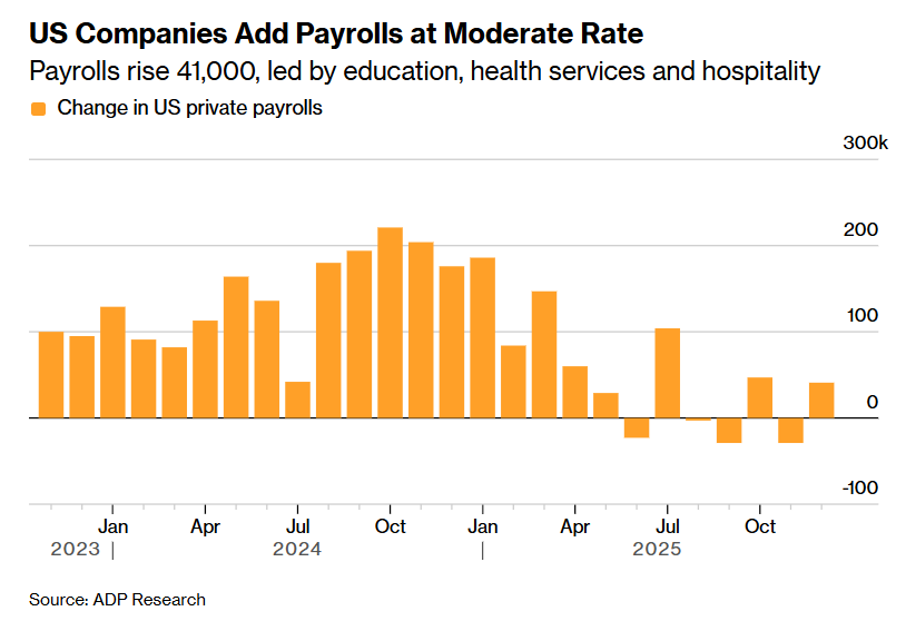 智通财经APP获悉,最新的"小非农"数据显示,美国企业在12月的招聘步伐以温和速度小幅度回升,表明迈入2026 年前的美国经济仍然韧性十足,有望为美国经济彻底实现"软着陆"奠定重大基础——在高盛、摩根士丹利等华尔街 金融巨头们看来,美国经济"软着陆"这一宏观主叙事在2026年有望明显升温——即美国经济在2026年的增速预计将 比市场预期更快。 根据ADP Research当地时间周三发布的美国私营部门就业数据(该项数据号称"小非农"),美国私营领域在12月的整 体就业人数增加4.1万人,此前一个月曾出现显著下降。相比之下,12月"小非农"不及更加乐观的市场一致预期,一 项面向经济学家们的调查显示,经济学家普遍预期为增加约5万人。 "即便大型雇主收缩用工规模,中小型私营机构在11月的暂时失业潮之后仍通过年末的积极招聘实现了整体私营就 业部门的回升态势。"ADP首席经济学家、同时也是知名财经撰稿人的Nela Richardson在一份声明中表示。 劳动力市场走弱一直是美联储官员们关注的重点,他们在2025年末连续三次宣布降息决策。美联储官员们在权衡新 一年进一步的潜在降息决策时,正努力在这一点与顽固的高于2%的通 ...