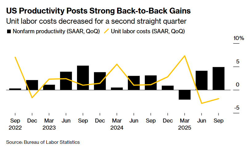 美国劳动生产率与劳动力市场数据 - 美国第三季度非农生产率以4.9%的年化季率大幅飙升,远高于市场预期的3%,为两年来最强劲增速 [1] - 第三季度单位劳动成本意外下降1.9%,为自2019年以来首次连续两个季度下降 [4] - 截至1月3日当周,美国首次申请失业救济人数增加8,000人至208,000人,略低于市场预期的210,000人,续请失业金人数为191万人 [1][4] 劳动力市场与就业状况 - 12月美国企业招聘人数增加41,000人,服务业招聘指标扩张至自2月以来最强劲水平 [8] - 12月美国企业宣布的裁员人数为2024年7月以来最低,招聘意向为自2022年以来任何12月的最高水平 [8] - 12月服务业PMI升至54.4,其就业分项指标回升至52.0,显示服务业用工改善,但制造业就业指标连续11个月萎缩 [9] 经济影响与驱动因素 - 生产率大幅回升有助于控制劳动成本,限制薪资驱动的通胀压力,为经济“软着陆”提供支撑 [7] - 人工智能投资浪潮及财政刺激法案中的资本开支激励措施,预计将推动美国未来整体生产率进一步提升 [7] - 生产率激增与单位劳动成本下降,表明企业正借助AI技术在人员更精简的情况下维持高效率运转,并试图缓解高关税影响 [2][7] 整体经济趋势 - 尽管2025年全年劳动力市场显著放缓,但美国经济在第三季度仍以两年来最快速度强劲增长,与生产率激增密切相关 [4] - 第三季度美国企业产出按年率计算超预期增长5.4%,高于前三个月的5.2%年化增长率 [4] - 近期多项就业数据显示,在经历2025年明显招聘放缓后,劳动力市场在新年之际呈现乐观增长势头,对2026年经济增长前景是积极消息 [8]