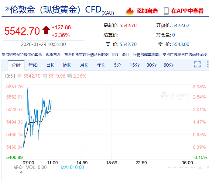 国际黄金期货价格和现货价格1月29日再创新高,盘中突破每盎司5500美元。 近期现货黄金接连突破多个整数关口: 1月26日早盘:突破5000美元; 1月26日午后,突破5100美元; 1月28日早盘:突破5200美元; 1月28日午后,突破5300美元; 1月28日尾盘:突破5400美元; 1月29日早盘:突破5500美元。 1月29日,现货白银向上触及118美元/盎司,创下历史新高,日内涨1.12%。 来源:央视新闻 ...