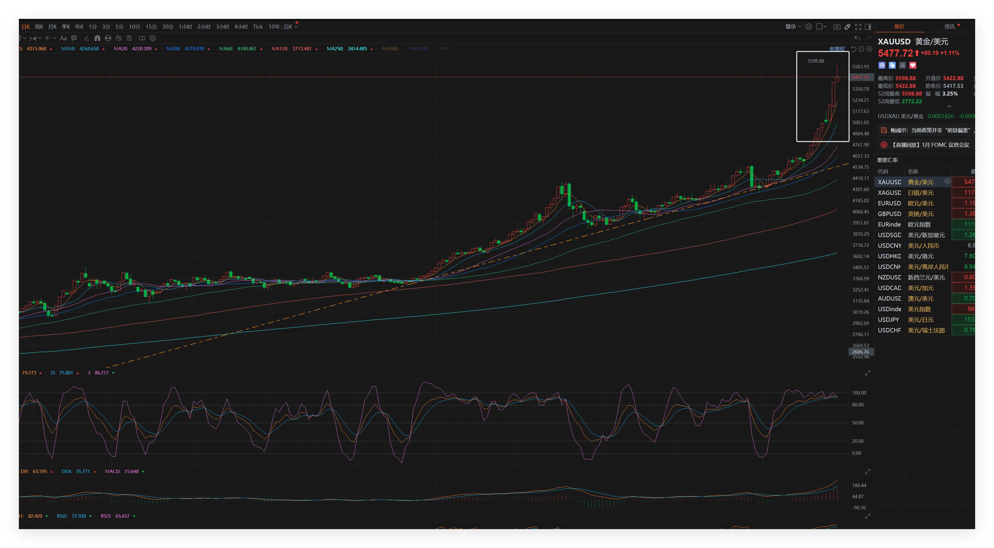 年度第二目标5600美元没想到这么快抵达了,行情完全受消息左右;能减仓就减仓,装口袋里的才是自己的。5600肯定不是长线的高点,因为我们看6000美 元以上;或许很快就能见到,完全看特朗普的一言一行。 | 日K 周K 月K 季K 年K 1分 3分 5分 10分 15分 30分 1小时 2小时 3小时 3小时 1ick 10年:日K・ | | --- | | ョ・H・イ・Aa ■ < ∩ 守 込 前 守 ♡ 血 の ◎ | | 5: 4315.860 ▲ MA10: 4268.650 △ MA20: 4220.389 ▲ MA30: 4179.039 △ MA60: 4100.867 ▲ MA120: 3773.487 | | -1 - adon | | 79.273 ▲ D: 75.801 ▲ J: 86.217 ▼ | 参与属于自己的行情,做看得懂的行情,做预期内的行情,赚认知的钱;否则,凭运气赚的钱,肯定会凭实力连本带利送出去! 但,1月份如此疯狂,尤其是最近两周,疯狂后必定一地鸡毛,如此快的拉升,今天或接下来几天会有快速的大暴跌,500美元(国内100块)以上,甚至 1000美元的那种。但是,无论去60 ...